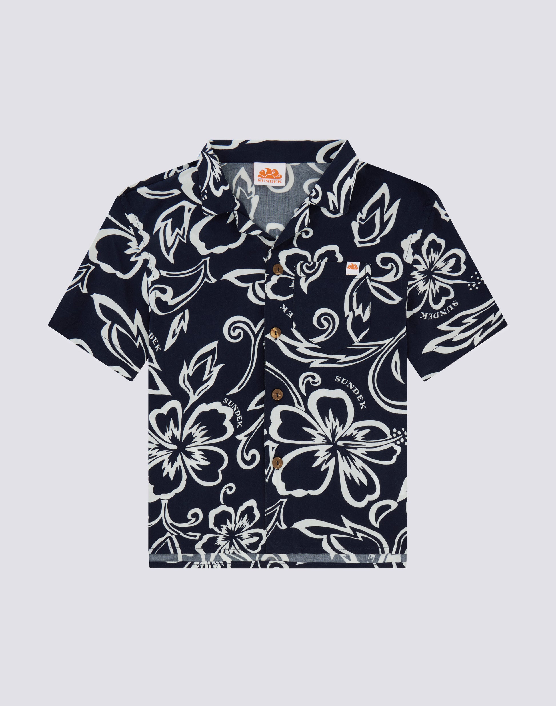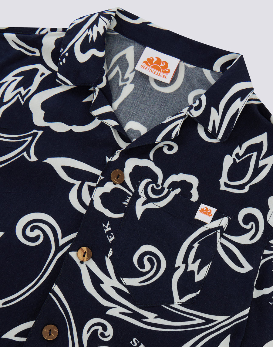 Tuffati nelle fantasie Sundek. Camicia da bambino a maniche corte modello bowling con stampa all over a ispirazione floreale. Realizzata in viscosa popeline, fresca e confortevole, da indossare per giocare e correre all'avventura!
