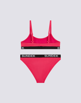 Scegli per la tua bimba questo bikini composto da top a fascia e slip con elastico, personalizzati dal logo a contrasto. Il tessuto ecosostenibile, morbido e resistente, è adatto a mille bagni e giochi in spiaggia.