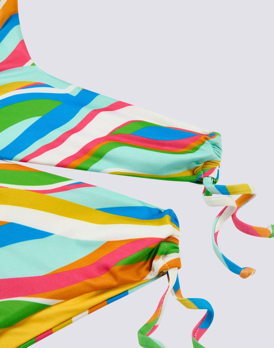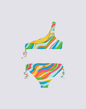 Bikini bambina con fantasia multicolor, formato dal top monospalla e dallo slip fisso con coulisse laterali.