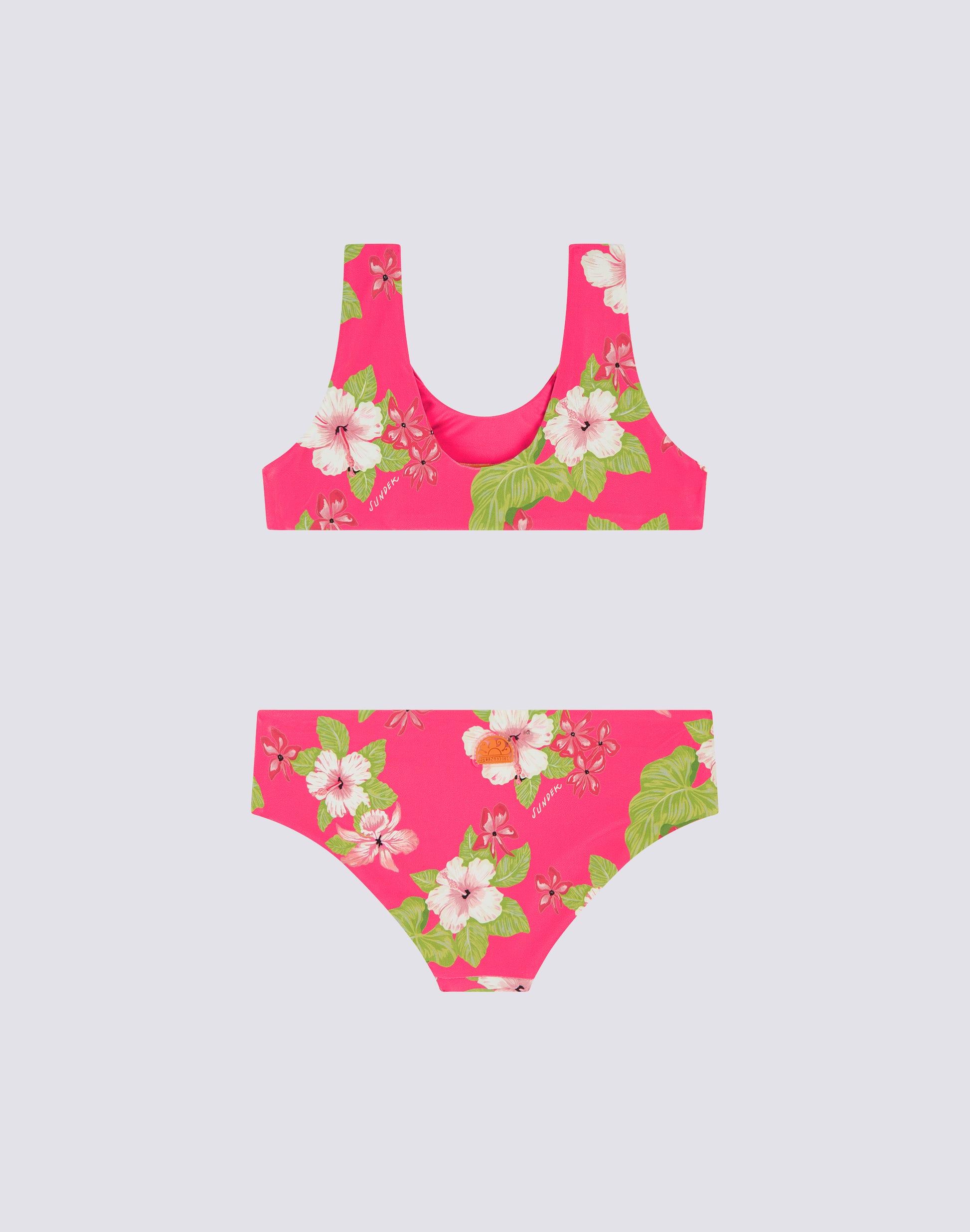 Mini bikini con top sportivo e slip fisso in stampa Dreamy Hawaii per bambina. Colorato e super confortevole.