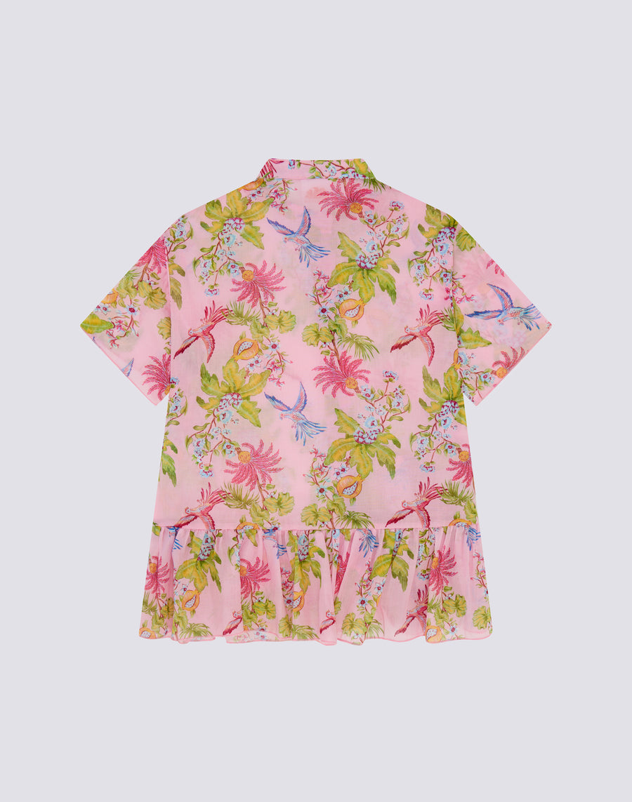Abito asimmetrico da bambina con stampa Sweet Parrot, manica corta e apertura con bottoni centrali.