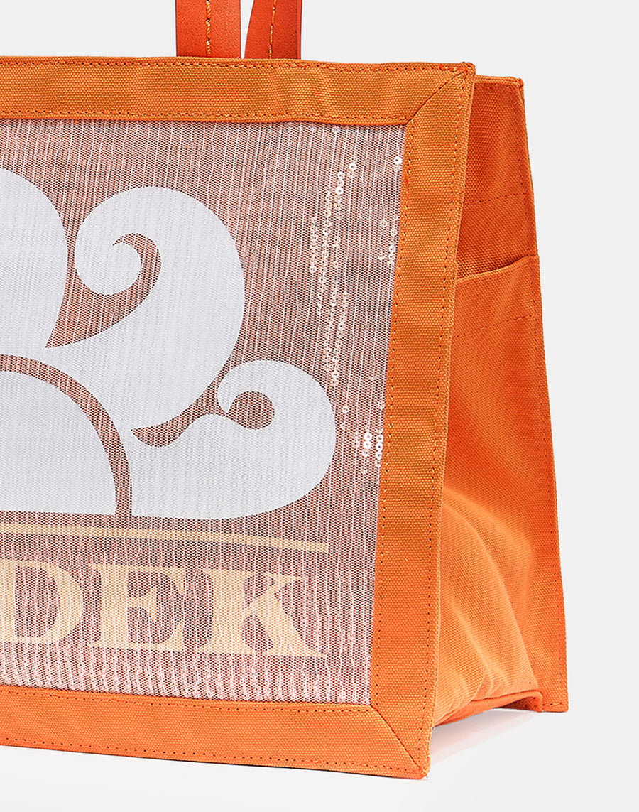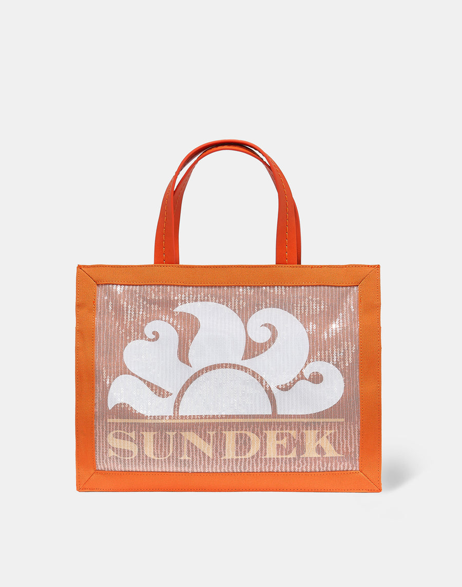 Borsa media in mesh con dettagli in paillettes con logo Sundek stampato. Questa borsa è perfetta per la spiaggia grazie alla sua rete a trame sottili che impediscono il passaggio della sabbia. Charm tavola da surf applicato.