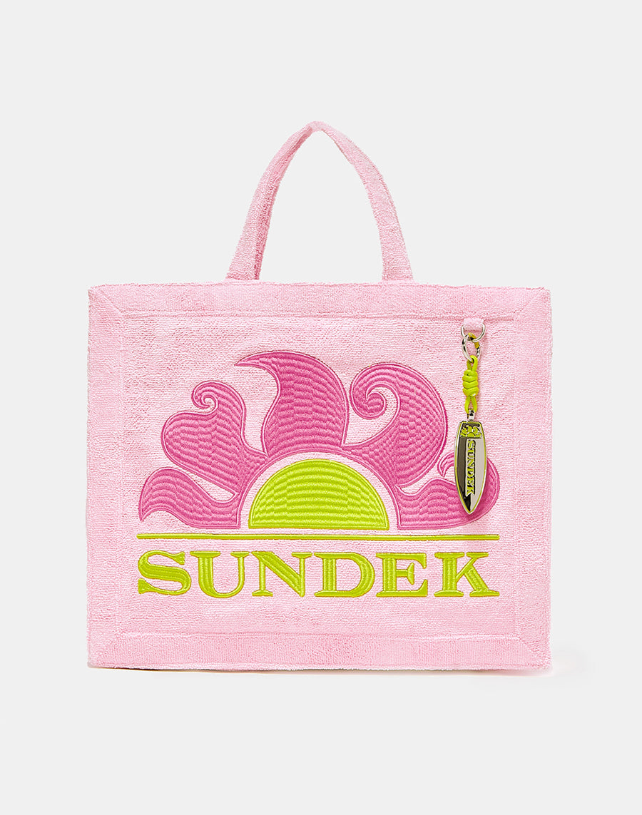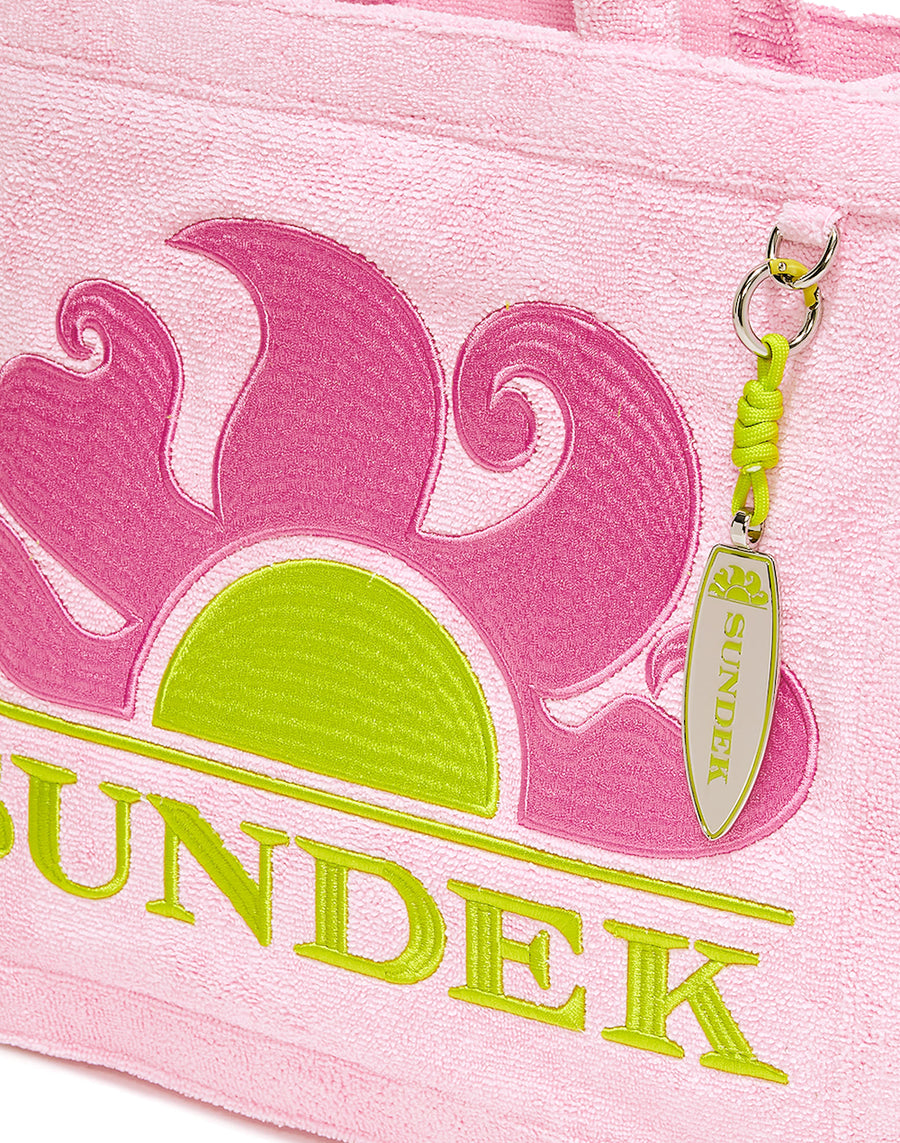 Borsa da mare a mano in spugna con logo ricamato. Charme con la caratteristica forma di tavola da surf.