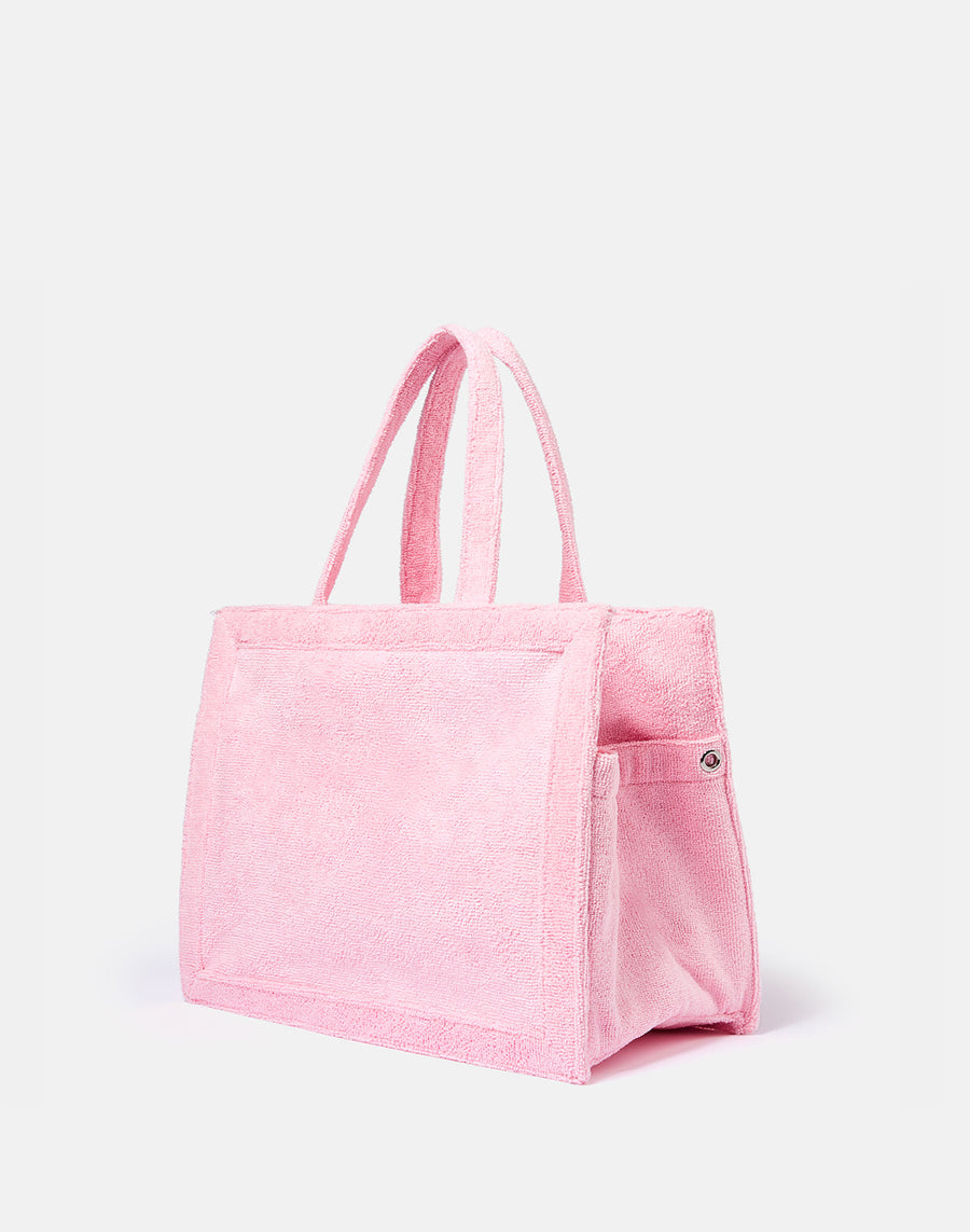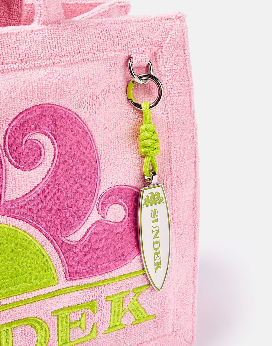 Borsa media a mano in spugna con logo ricamato. Charm con la caratteristica forma di tavola da surf.