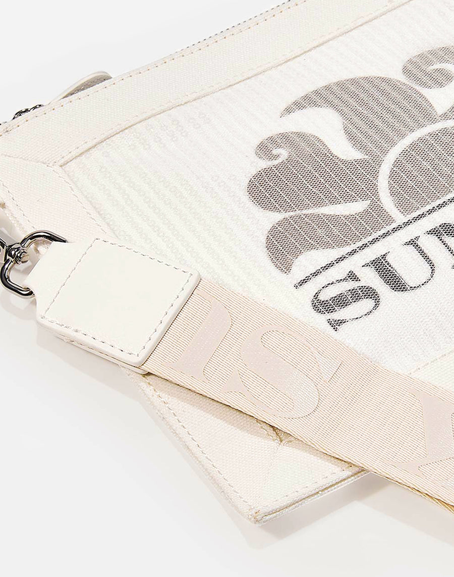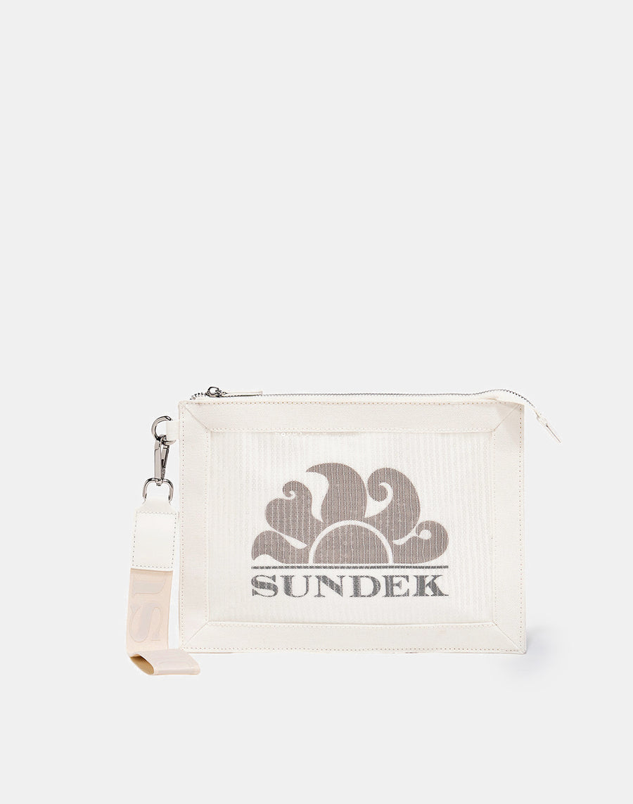 Clutch in mesh con paillettes e logo Sundek ricamato. Perfetta sia come necessaire che da usare come pochette. Laccetto con logo Sundek rimovibile. Misure: 27 x 20.5cm