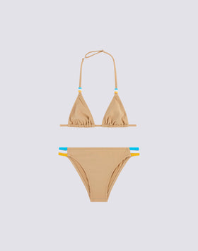 Bikini mare bambina con top a triangolo regolabile con i laccetti dietro al collo impreziositi da perline tricolori. I tre colori delle perline sono riproposti sul dettaglio tricolore laterale dello slip. I due pezzi del costume sono realizzati in tessuto VITA by Carvico confortevole, resistente e che non teme cloro e creme solari.