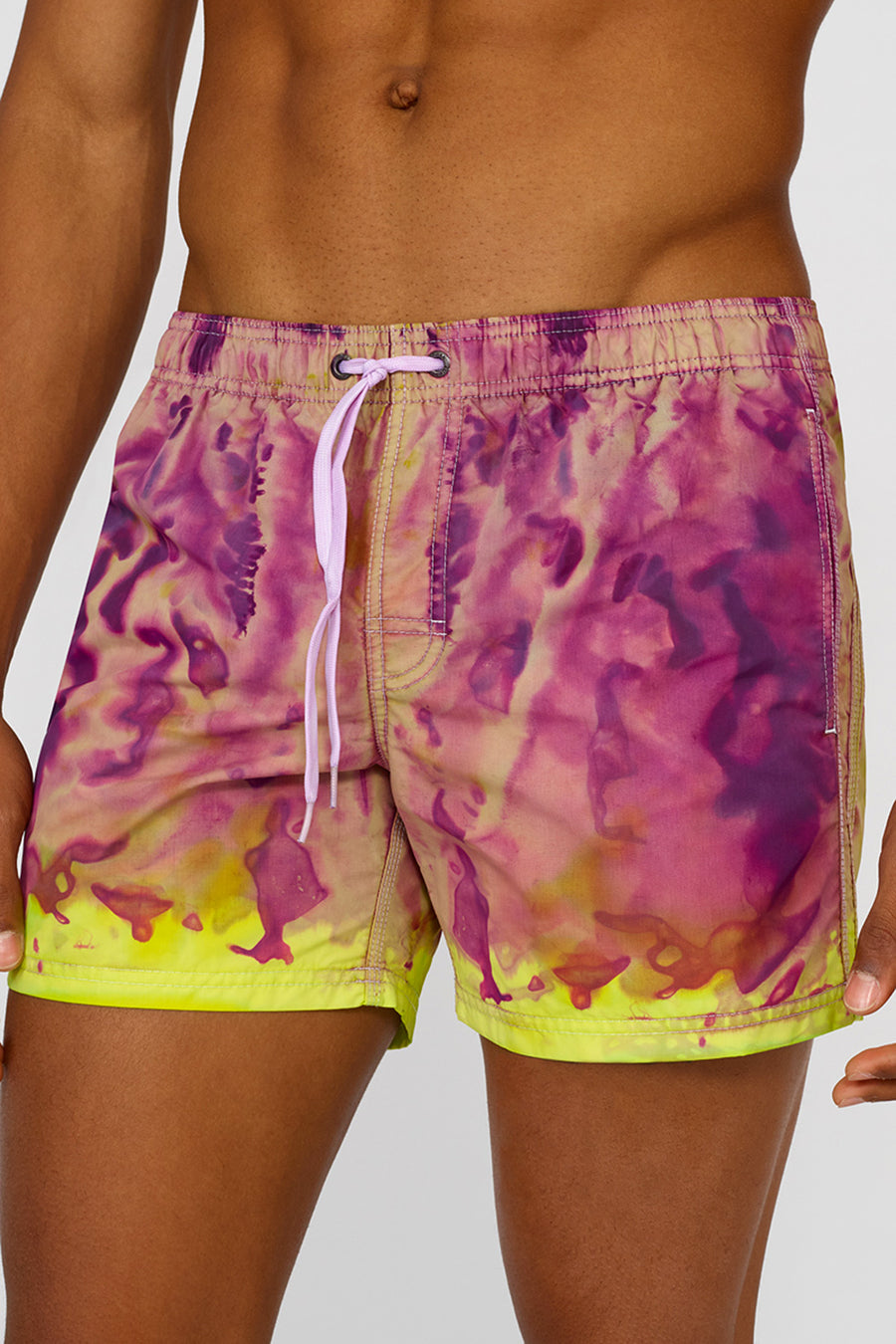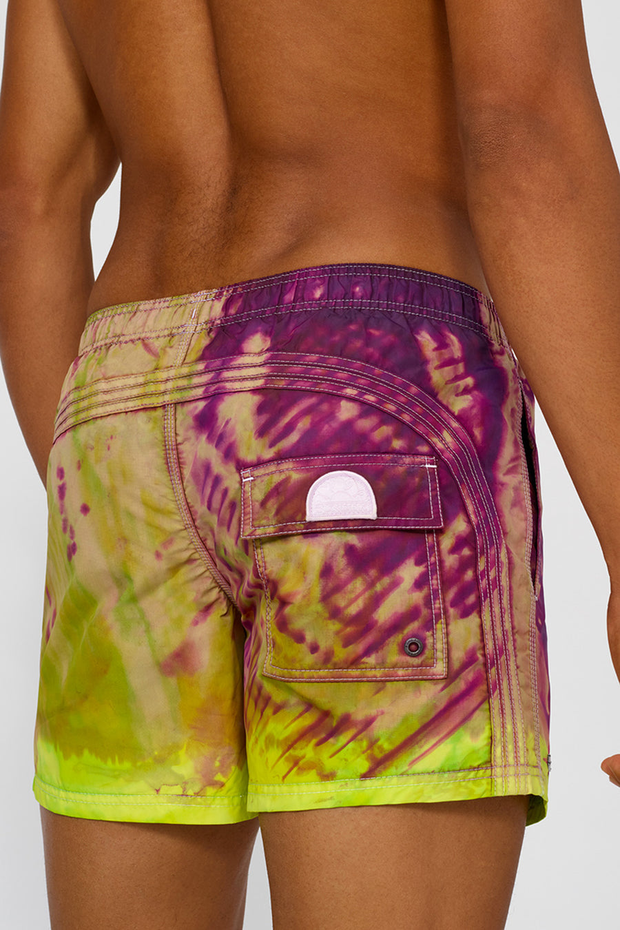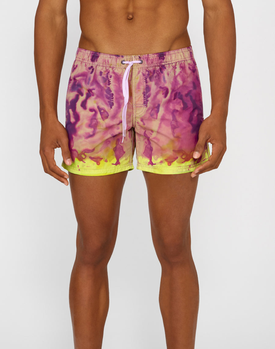 Preparati a cavalcare la prossima onda con il costume da bagno corto a vita elasticata con speciale lavorazione tie-dye, trattato e tinto con tecniche artigianali. Il tessuto storico nylon taffeta e la costruzione del modello lo rende veloce nell'asciugatura e super resistente stagione dopo stagione. Vestibilità a vita bassa.