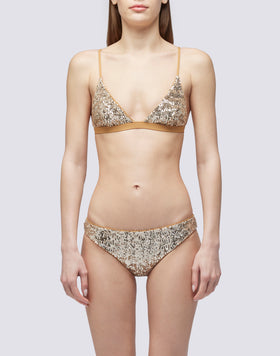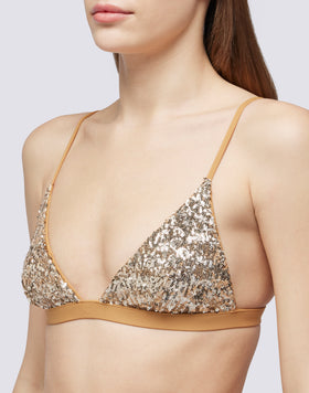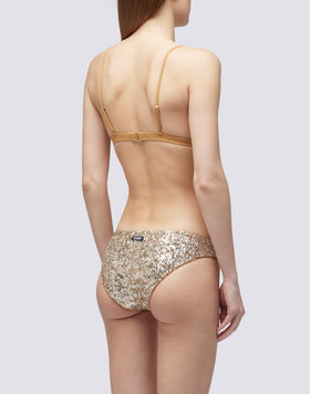 Rendi unico il tuo outfit con il top Napa con paillettes. I profili e i lacci regolabili in morbida lycra lo rendono confortevole, mantenendo un look sempre alla moda. Da completare con il suo slip coordinato.