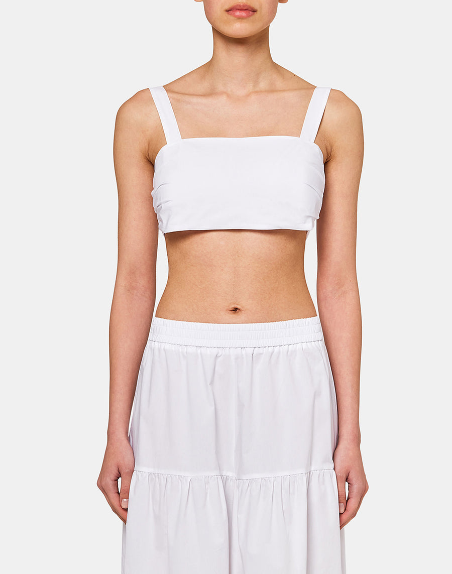 Fiocco scenografico per il top a fascia in popeline di cotone tinta unita. Lo puoi abbinare ai pantaloni a balze in coordinato.