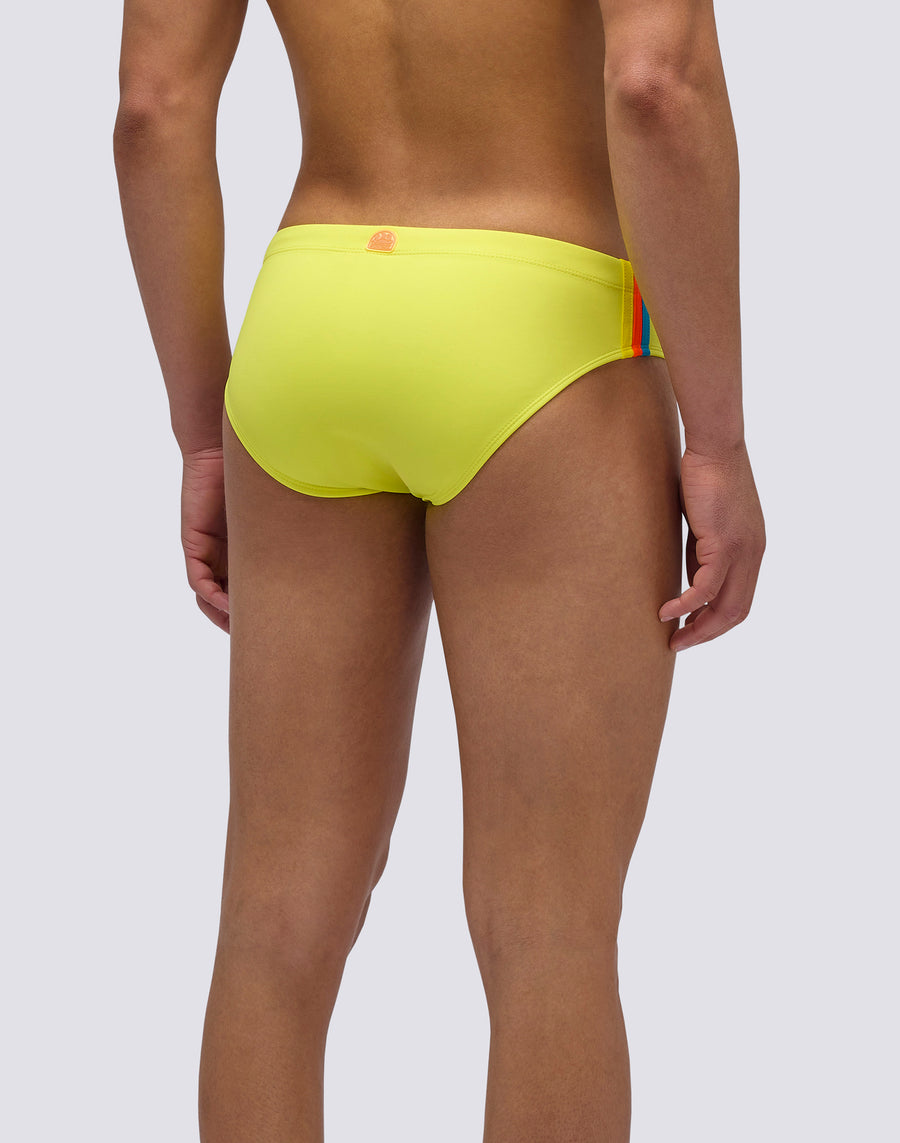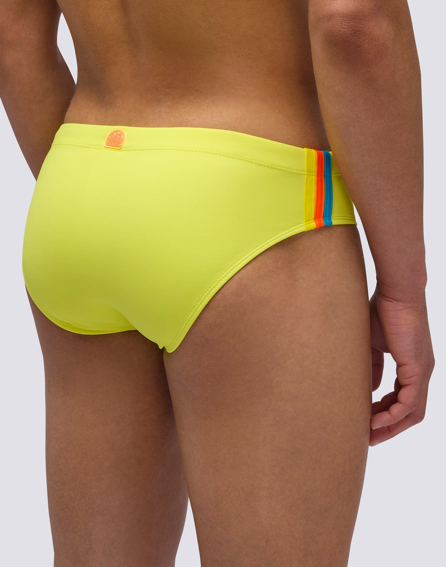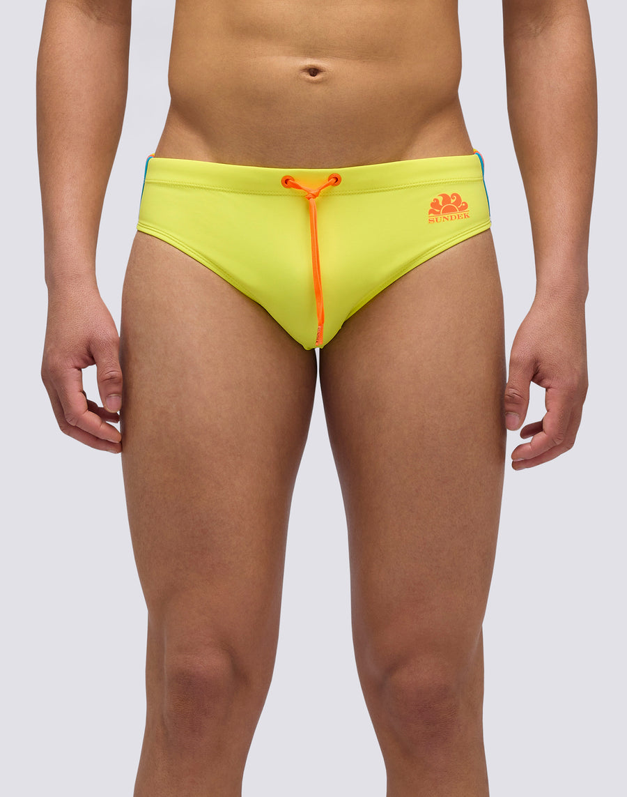 Costume slip uomo tinta unita e vita regolabile. Lo slip da mare monocromo con laccio coulisse e tre bande laterali colorate a contrasto per un look deciso e funzionale. Si asciuga velocemente e ti dà comfort e resistenza in acqua e fuori dall'acqua: indossalo per nuotare e allenarti e quando ti riposi e prendi il sole.