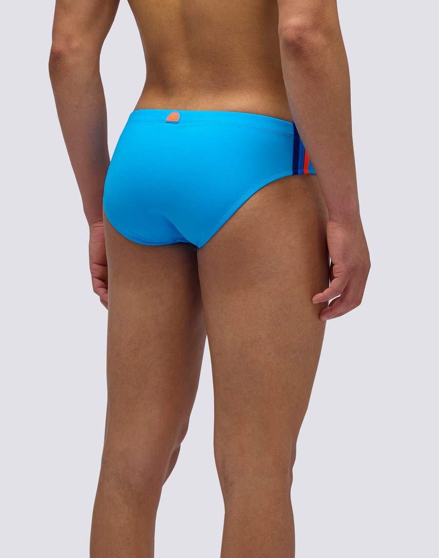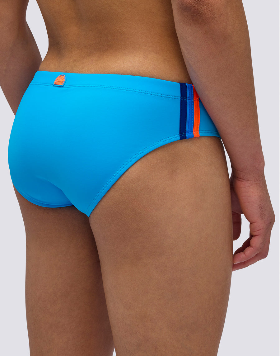 Costume slip uomo tinta unita e vita regolabile. Lo slip da mare monocromo con laccio coulisse e tre bande laterali colorate a contrasto per un look deciso e funzionale. Si asciuga velocemente e ti dà comfort e resistenza in acqua e fuori dall'acqua: indossalo per nuotare e allenarti e quando ti riposi e prendi il sole.