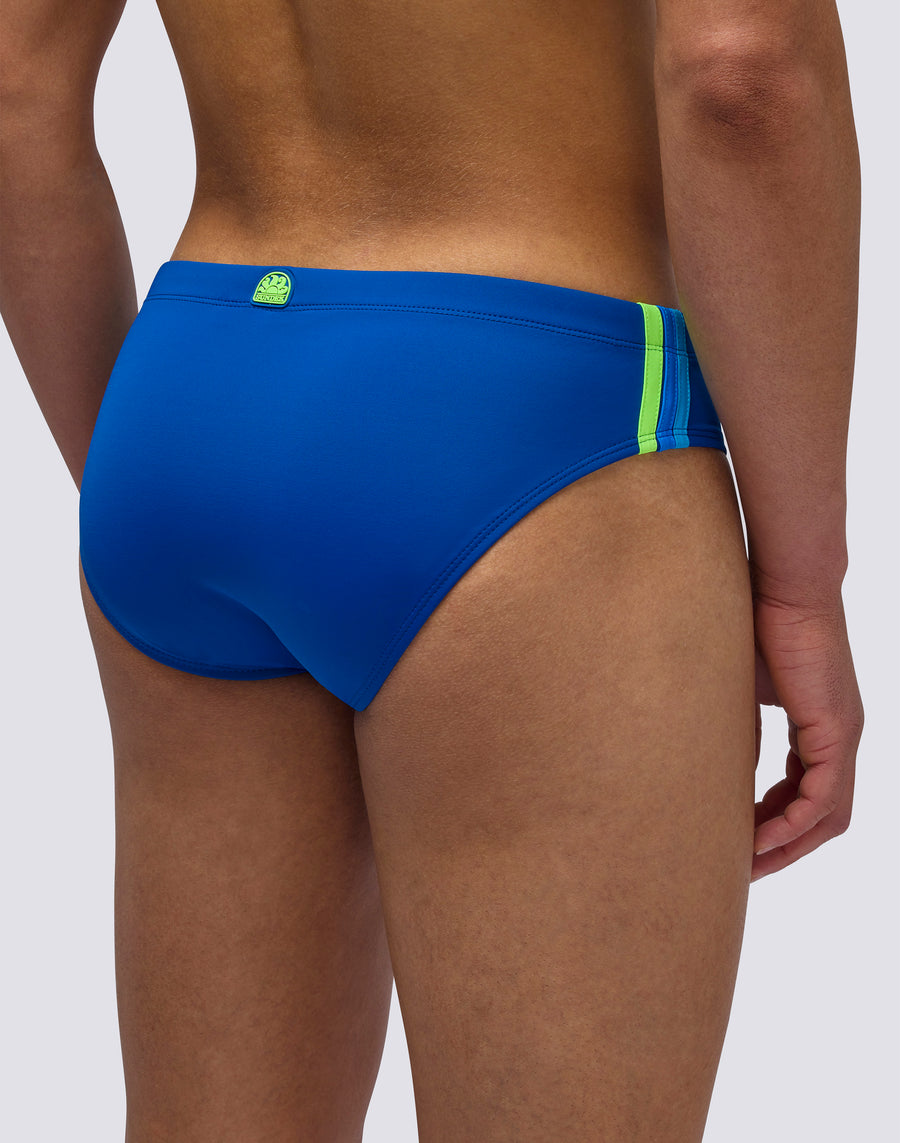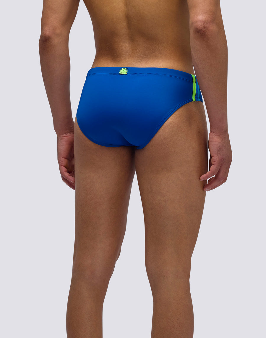Costume slip uomo tinta unita e vita regolabile. Lo slip da mare monocromo con laccio coulisse e tre bande laterali colorate a contrasto per un look deciso e funzionale. Si asciuga velocemente e ti dà comfort e resistenza in acqua e fuori dall'acqua: indossalo per nuotare e allenarti e quando ti riposi e prendi il sole.