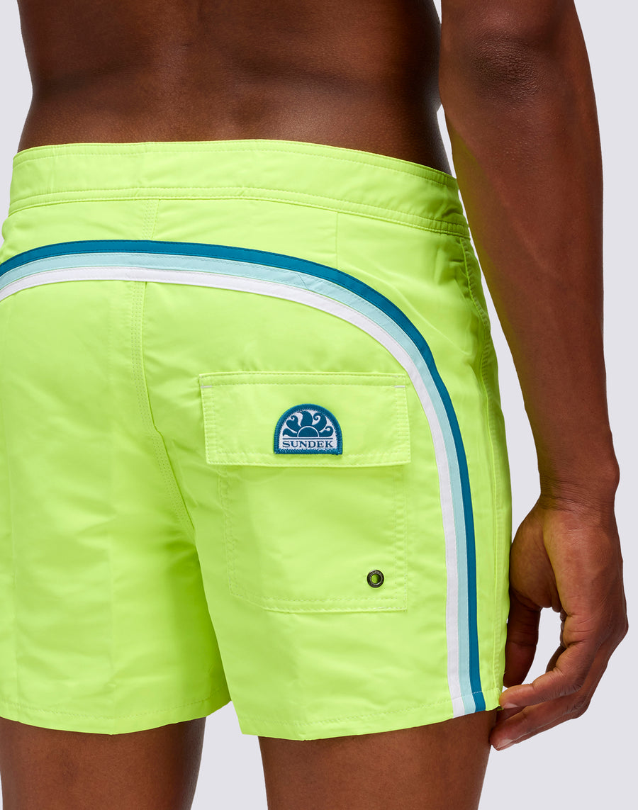 Energia vibrante, colore intenso e l’iconico arcobaleno Sundek che fa capolino per questo costume boxer da uomo. E' realizzato nel nostro tessuto storico nylon taffetà, dalla mano serica confortevole e ad asciugatura rapida, mentre le cuciture a tre aghi lo rendono resistente vacanza dopo vacanza. Lunghezza 35 cm (taglia M), misurati sul lato esterno della gamba.