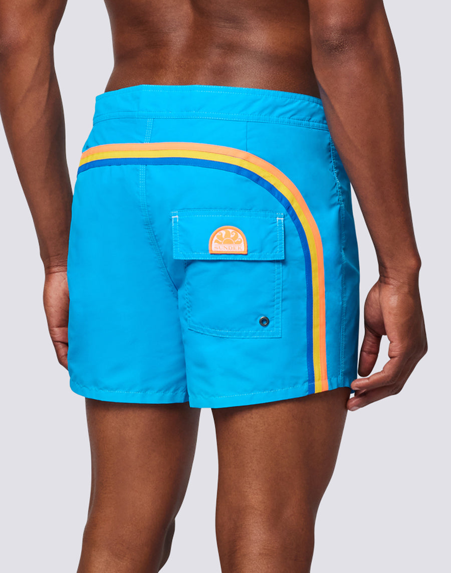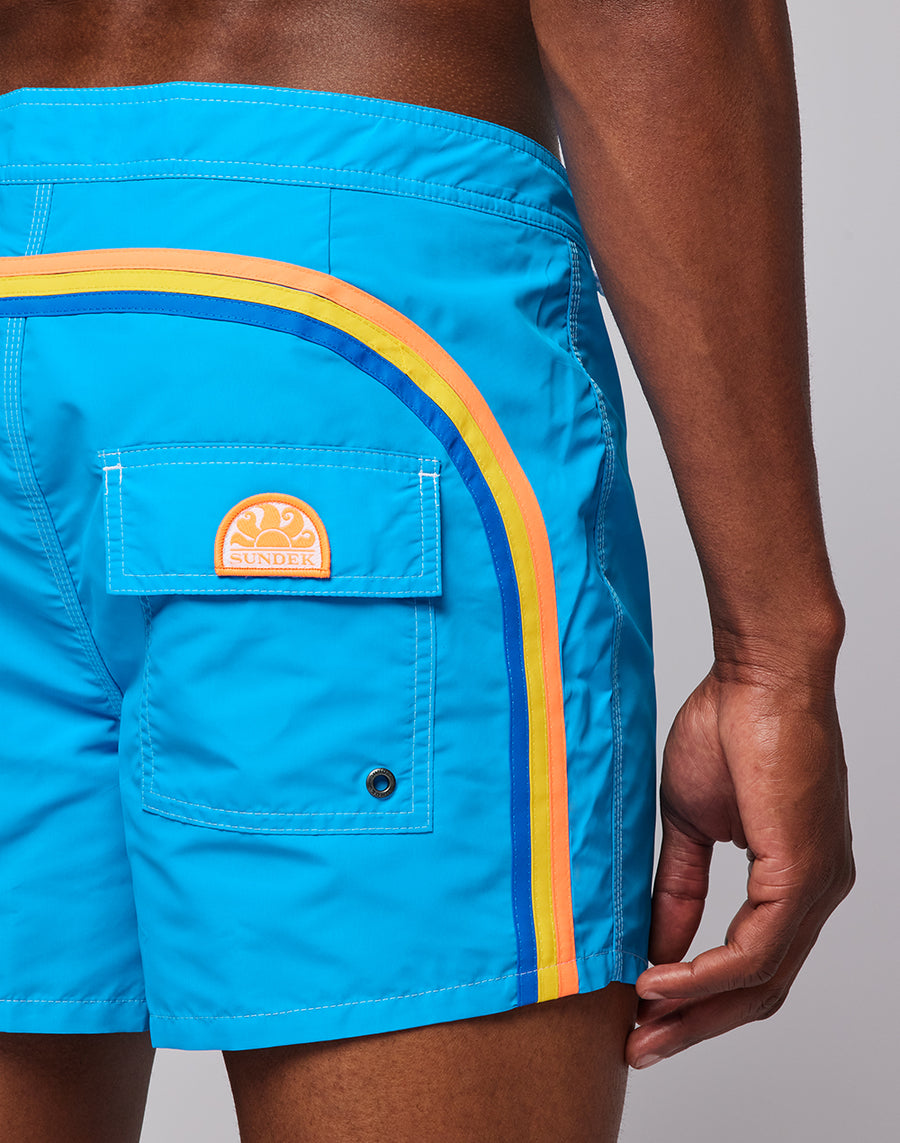 Energia vibrante, colore intenso e l’iconico arcobaleno Sundek che fa capolino per questo costume boxer da uomo. E' realizzato nel nostro tessuto storico nylon taffetà, dalla mano serica confortevole e ad asciugatura rapida, mentre le cuciture a tre aghi lo rendono resistente vacanza dopo vacanza. Lunghezza 35 cm (taglia M), misurati sul lato esterno della gamba.