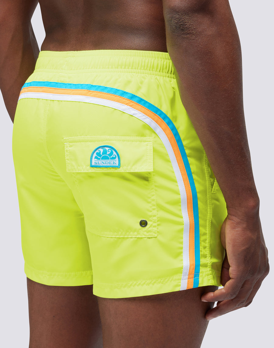 Costume da bagno corto con vita elasticata, realizzato nel nostro iconico tessuto Nylon Taffetà. Dotato di triple cuciture sulle aree di maggior stress, garantisce resistenza e durabilità del tempo. L'iconico arcobaleno caratterizza il back. Lunghezza sull'esterno coscia 14''/35 cm (in taglia M).