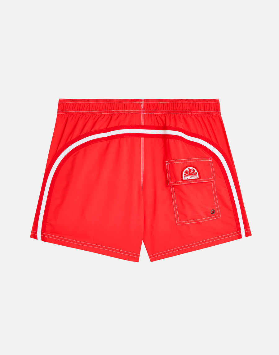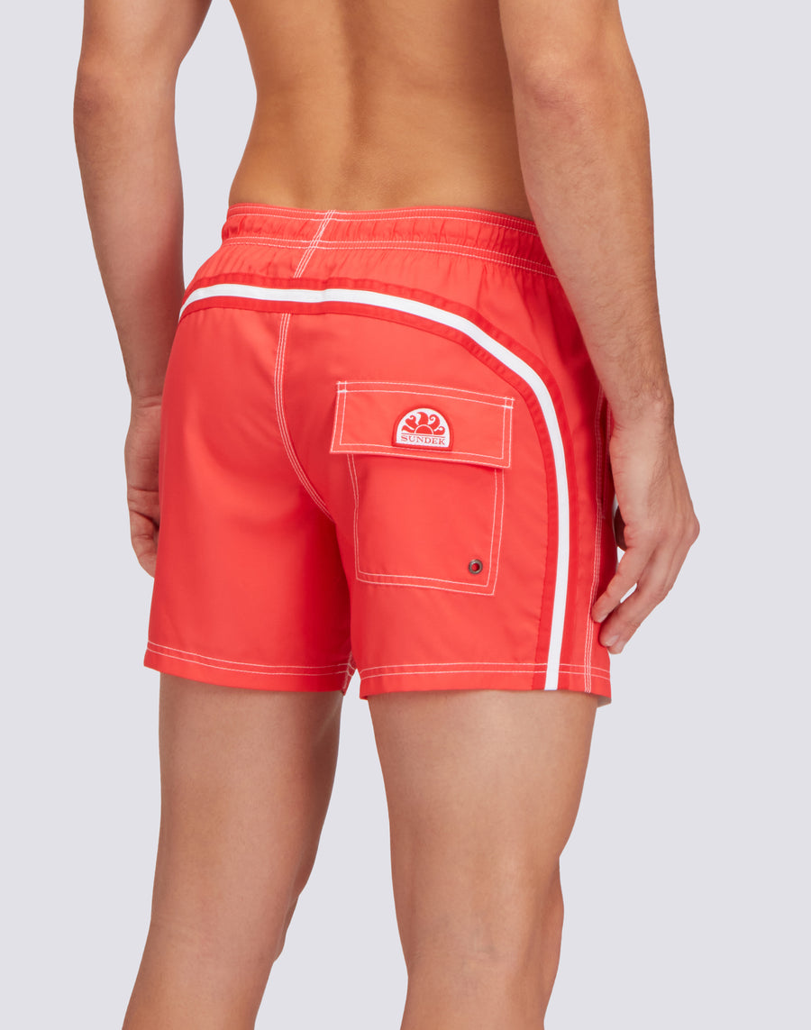 Costume da bagno a pantaloncino da uomo in tessuto riciclato Repreve®, tessuto super leggero dall'asciugatura rapida. Dettaglio iconico arcobaleno Sundek sul back e rappresentazione bandiera del Canada. Lunghezza esterno coscia 14”/35 CM (in taglia M).