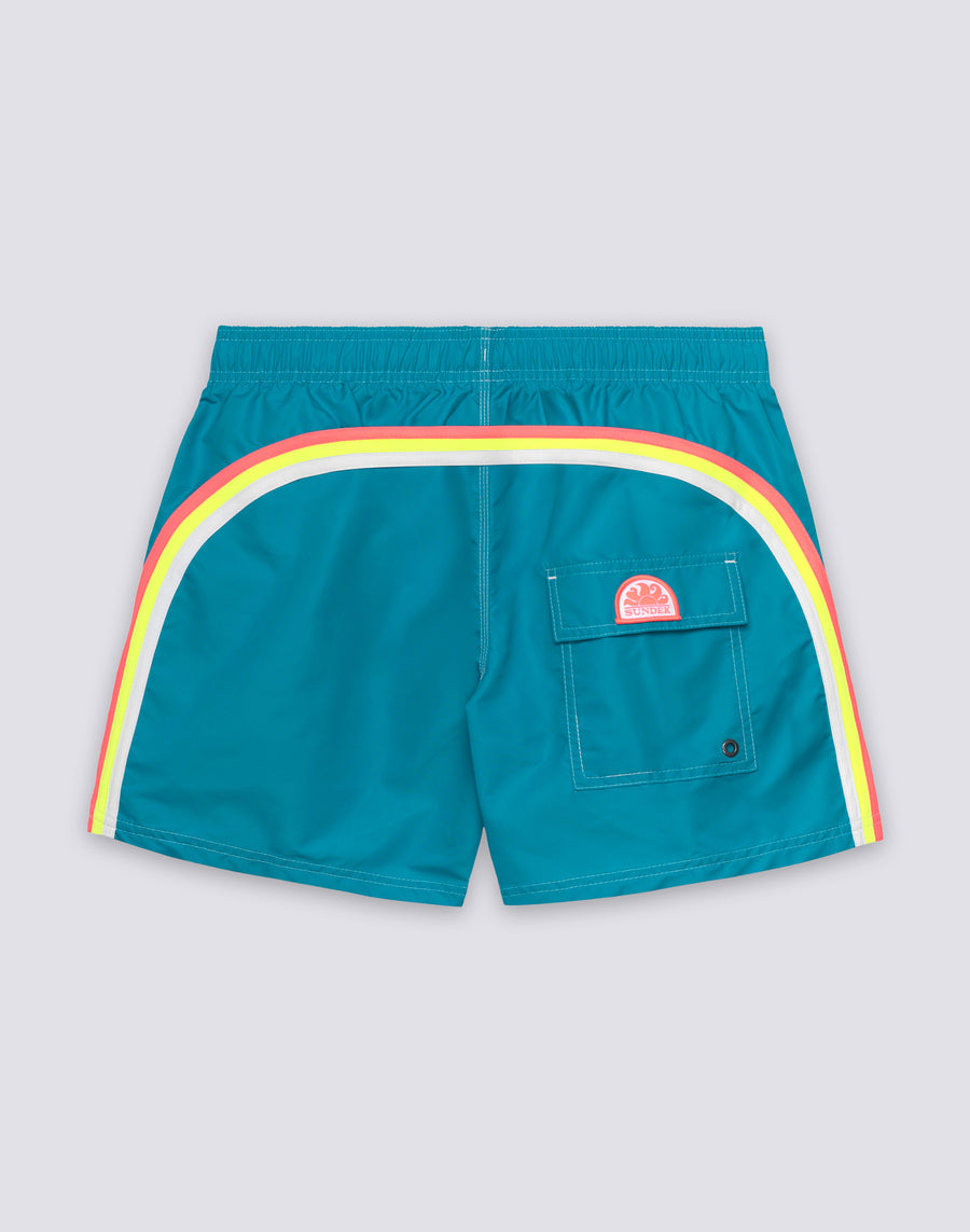 Caratterizzato dall'inconfondibile arcobaleno Sundek sul retro, simbolo di autenticità e heritage del brand, questo shorts mare presenta una vita elasticata con coulisse regolabile per una vestibilità personalizzata. Le cuciture a tre aghi garantiscono massima resistenza e durata nel tempo, anche dopo innumerevoli sessioni di surf, nuoto e sole.