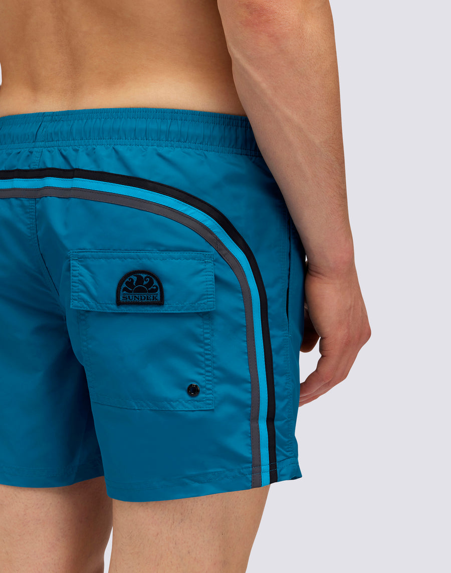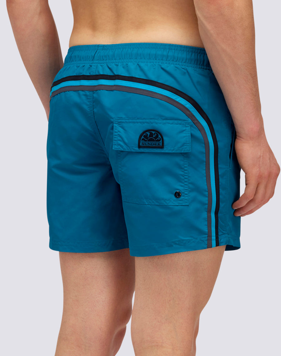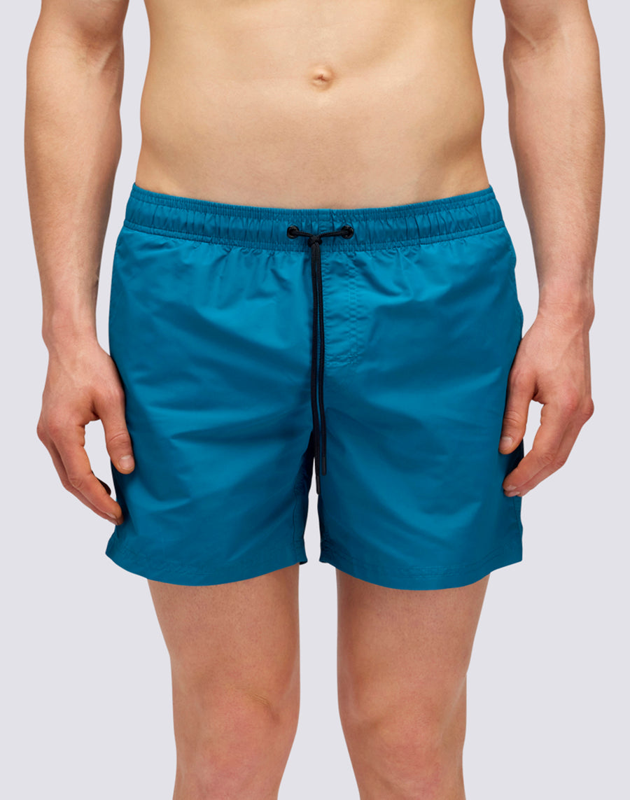 Shorts uomo mare corto e con vita elasticata, coulisse e iconico arcobaleno Sundek sul retro in versione scura. Questo costume è realizzato con cuciture a tre aghi e al 100% con il nostro tessuto storico, il nylon-taffetà: liscio come la seta, leggero e resistente a tutto, si asciuga velocissimo per darti comodità ovunque, tra le onde e fuori dall'acqua. Lunghezza 35 cm (taglia M), misurati sul lato esterno della gamba.