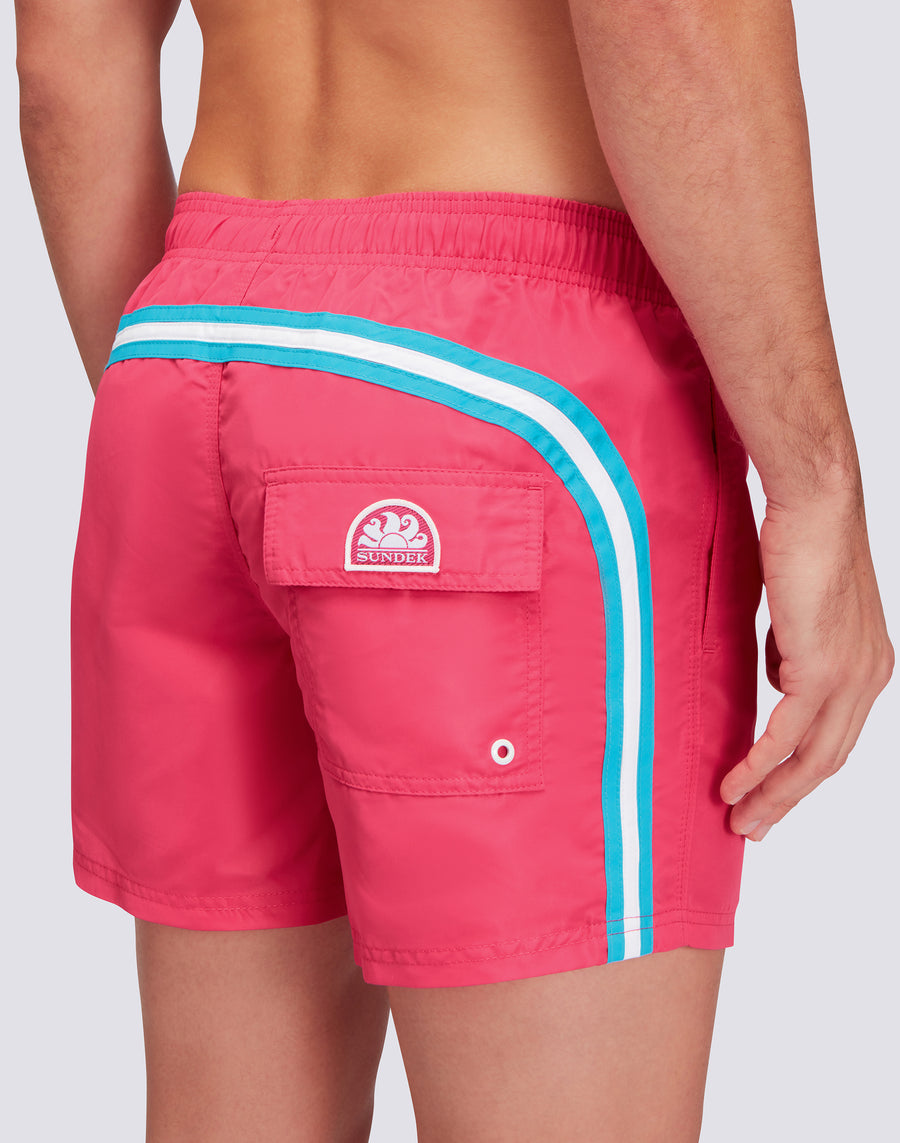 Shorts uomo mare corto e con vita elasticata, coulisse e arcobaleno Sundek a doppio colore (2 strisce uguali e una terza nel mezzo). Questo costume è realizzato con cuciture a tre aghi e al 100% con il nostro tessuto storico, il nylon-taffetà: liscio come la seta, leggero e resistente a tutto, si asciuga velocissimo per darti comodità ovunque, tra le onde e fuori dall'acqua.