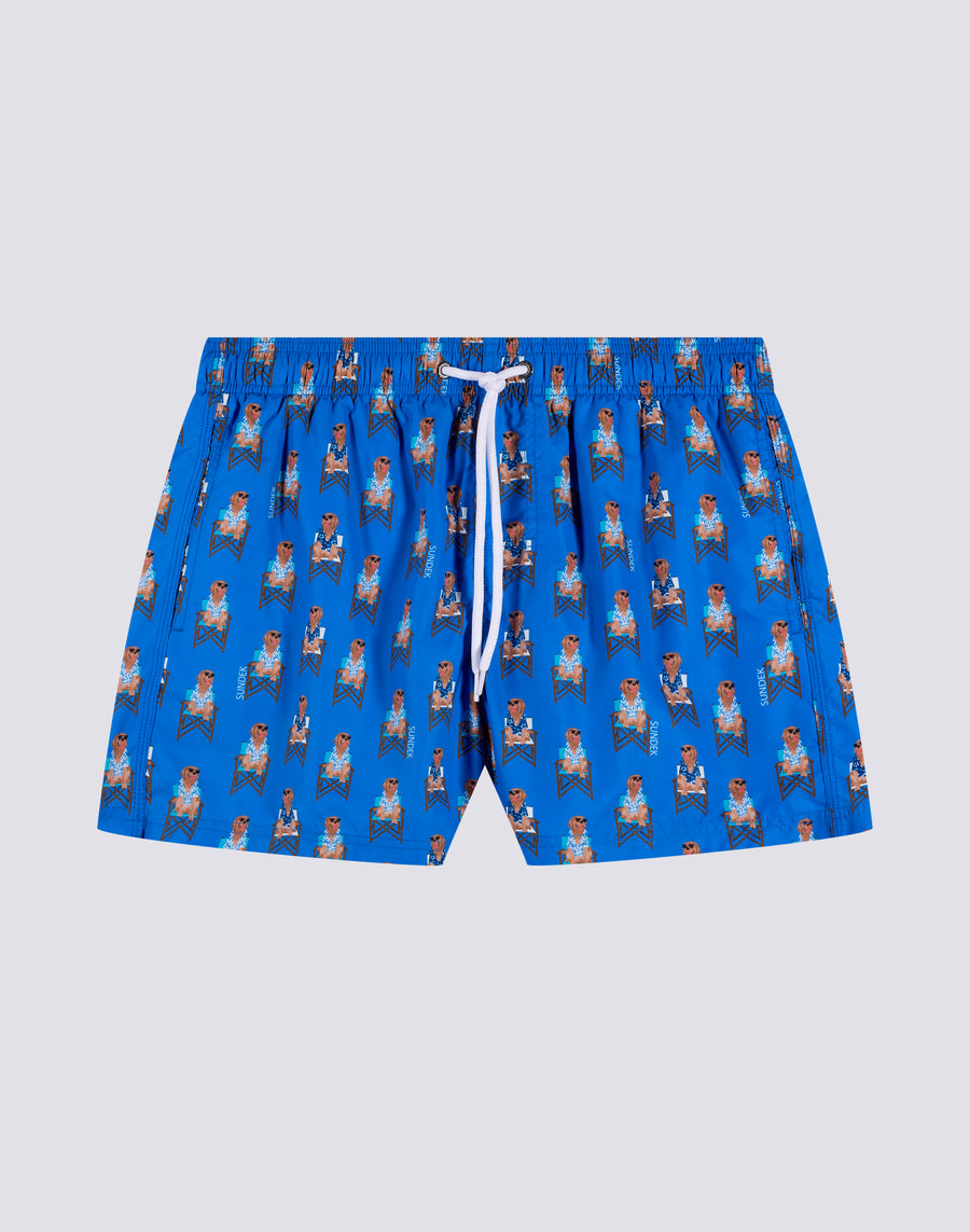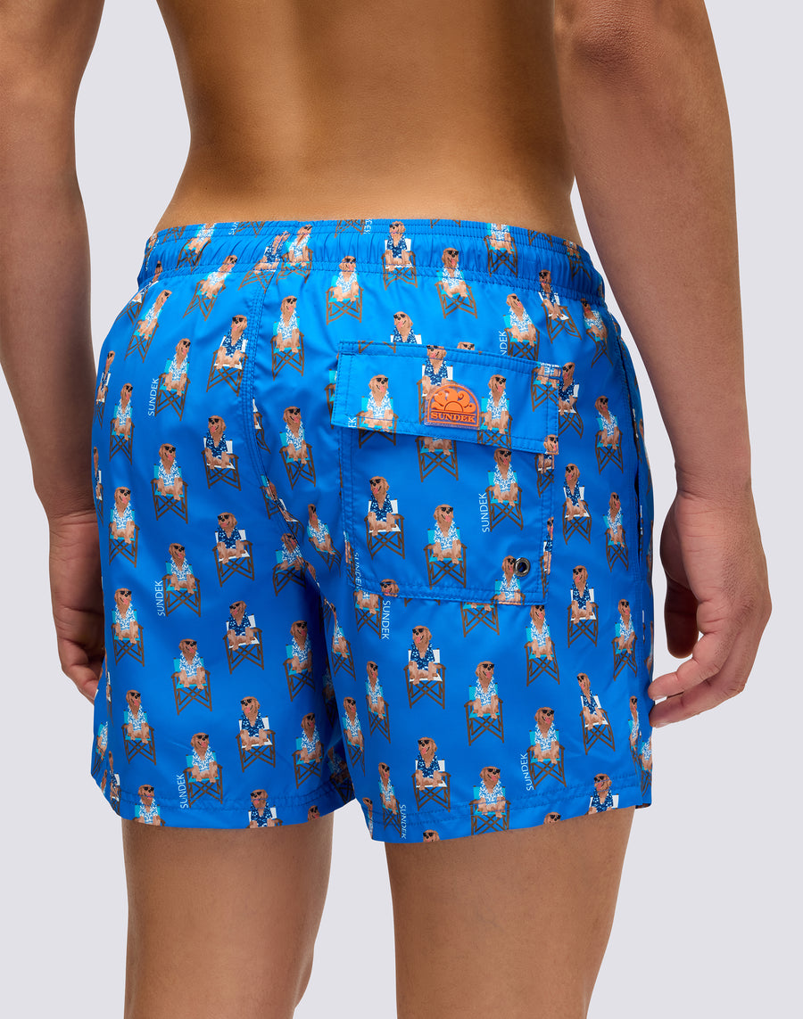 Costume da bagno uomo della collezione capsule Pelo, dedicata agli amici a quattro zampe. Questo modello "Lookout Golden Retriever" presenta l'omonima razza canina ed è realizzato in poliestere riciclato. Perfetto per chi ama i cani e desidera un capo confortevole, sostenibile e dal design unico per le giornate al mare.