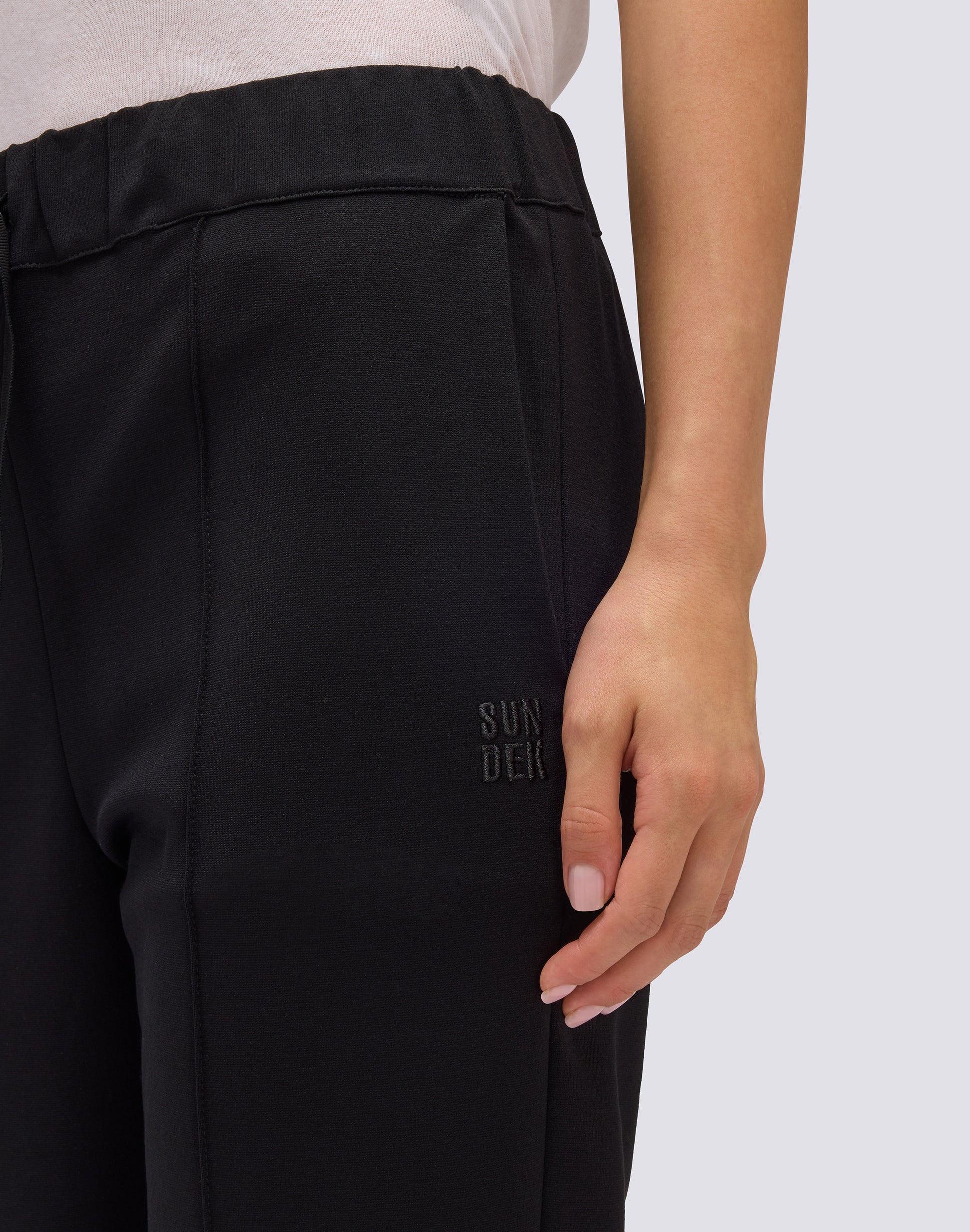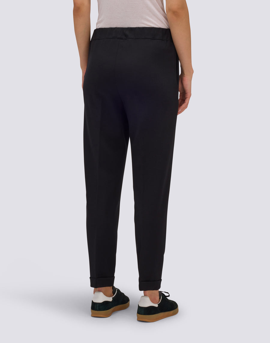 Pantaloni lunghi donna in punto Milan con coulisse regolabile in vita, tasche laterali, piega frontale centrale e orli fissi con risvolto. Fit a sigaretta. Vestibilità slim.