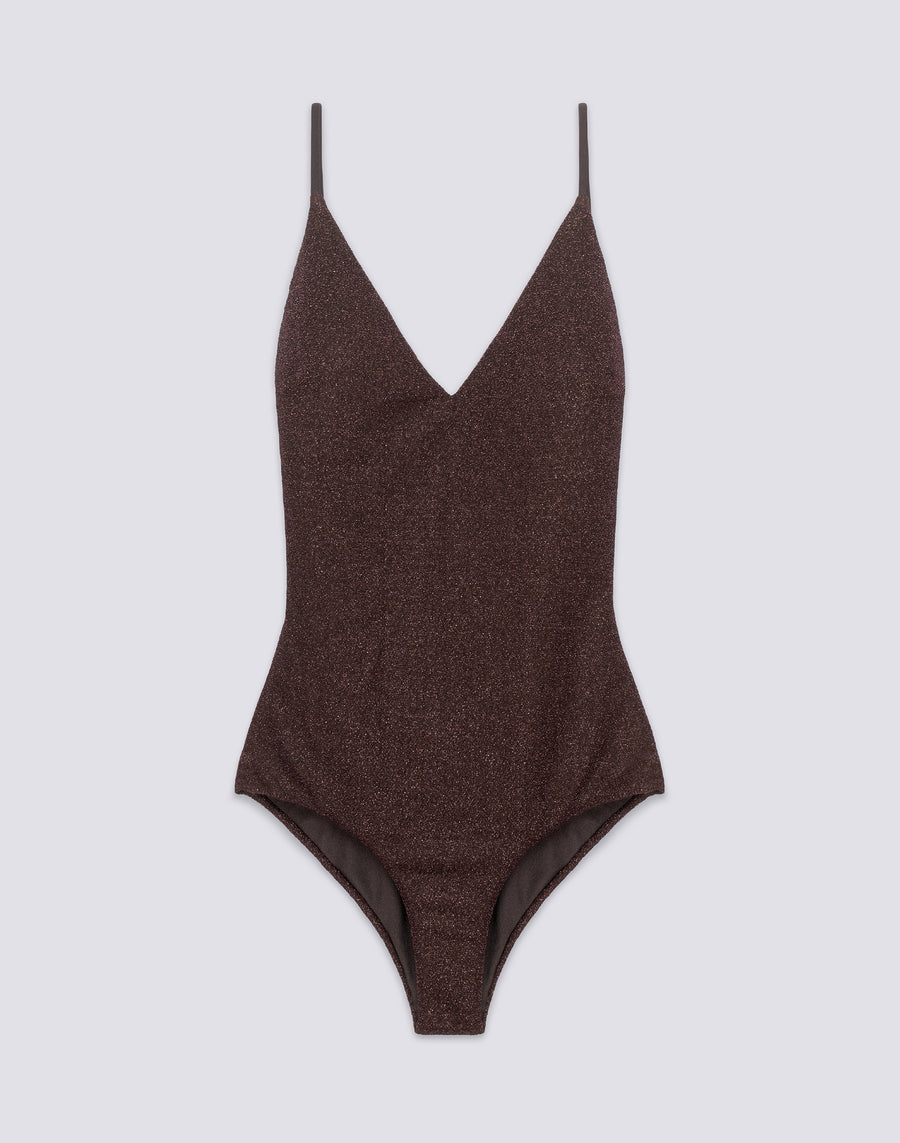 L'eleganza è protagonista di questo costume intero in lurex, da indossare in spiaggia ma anche in contesti diversi - aperitivo, serata, cena, passeggiata - per dare vita a outfit estivi d'impatto. I lacci incrociati dietro creano una linea fluida e sofisticata.