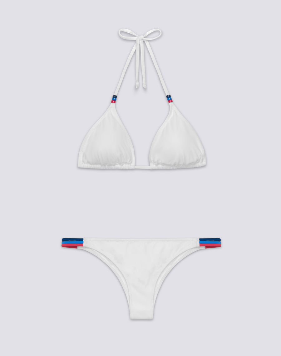 Fai spazio in valigia a questo completo bikini realizzato in tessuto ecosostenibile. Il triangolo è a vela, imbottito, con perline removibili sui laccetti. Lo slip è fisso con dettaglio laterale a tre bande tricolore in stile Sundek.