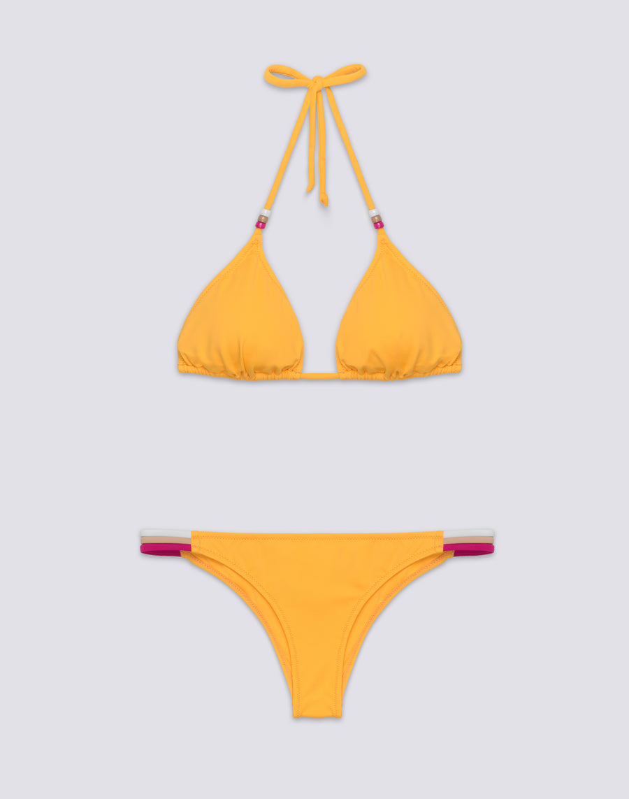 Fai spazio in valigia a questo completo bikini realizzato in tessuto ecosostenibile. Il triangolo è a vela, imbottito, con perline removibili sui laccetti. Lo slip è fisso con dettaglio laterale a tre bande tricolore in stile Sundek.