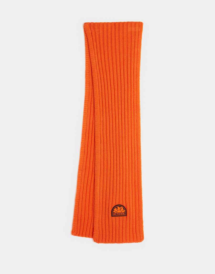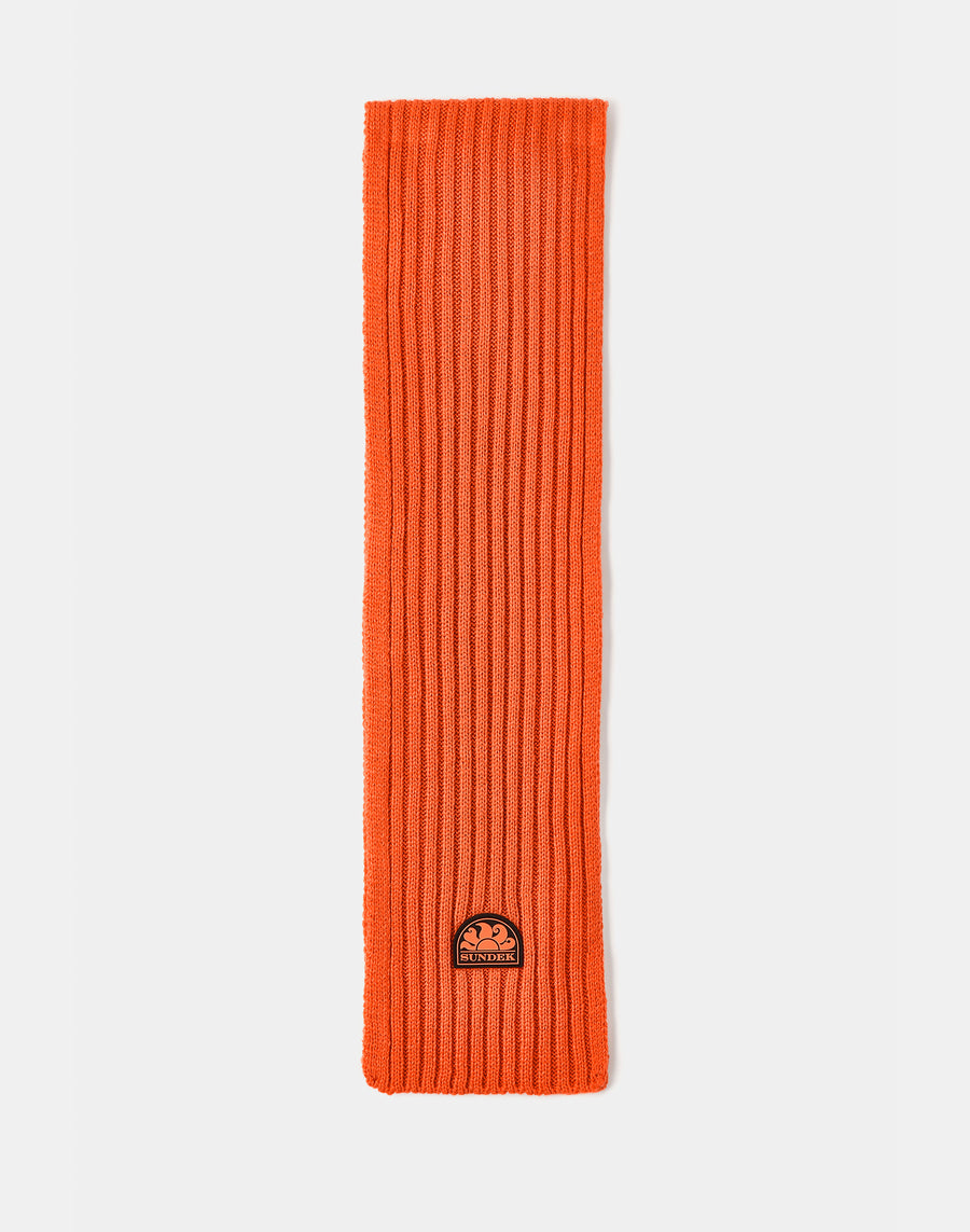 Ribbed knit scarf with patch.