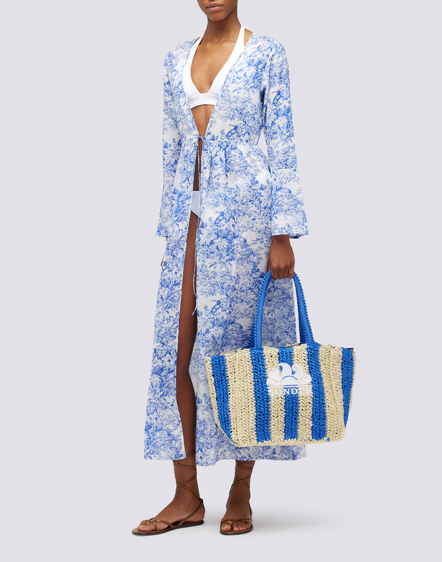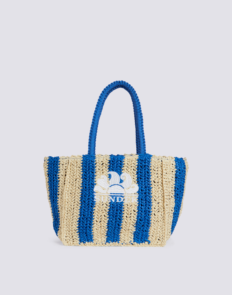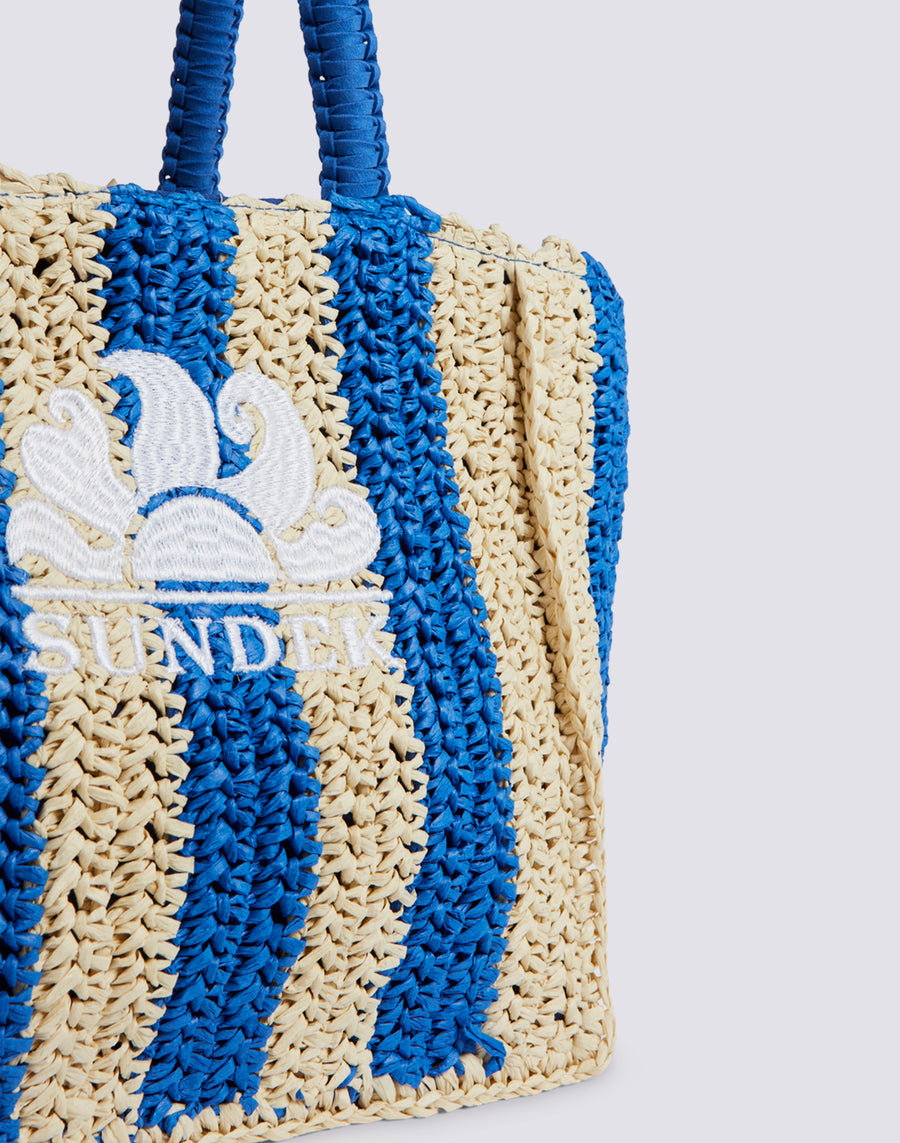 Elegant woven straw bag with embroidered logo and zip closure. Equipped with an internal mini pocket, it is perfect for the beach or for a walk in the centre, to always have everything you need with you.