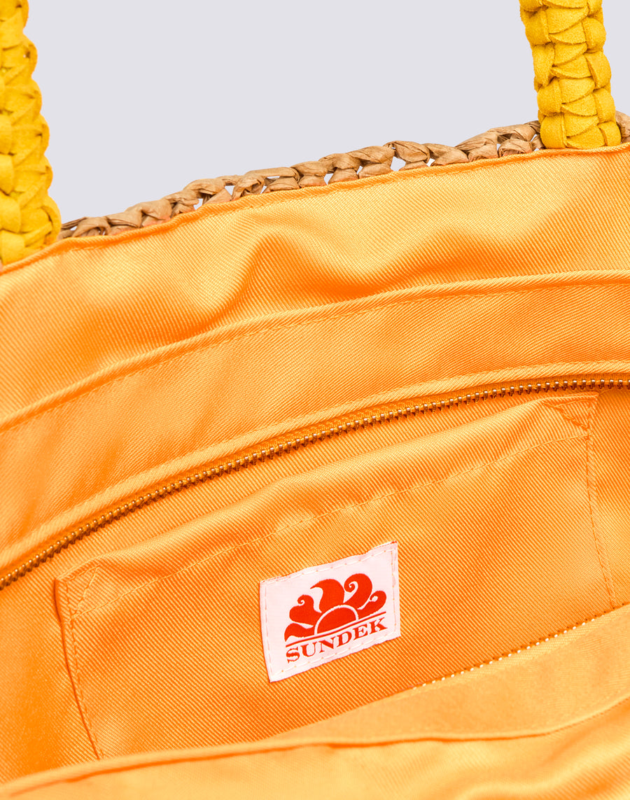 Paper straw shopping bag with FOLLOW THE SUN slogan in towelling, decoration on the handle and zip closure. A different, original model, suitable for various types of look.