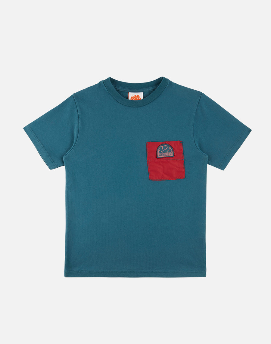 Boy's double-dye T-shirt featuring a contrasting chest pocket. Short sleeves, round neck, made of soft cotton.