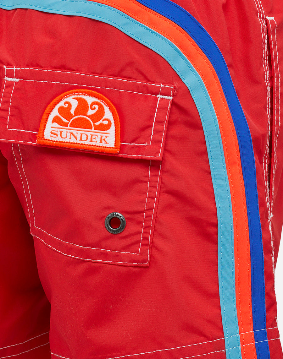 Internal mesh briefs Side pockets Back patch pocket with flap closed by Velcro Logo patch The unmistakable multicolor rainbow on the back Length of 26 cm (size 6 years), measured on the outside of the leg