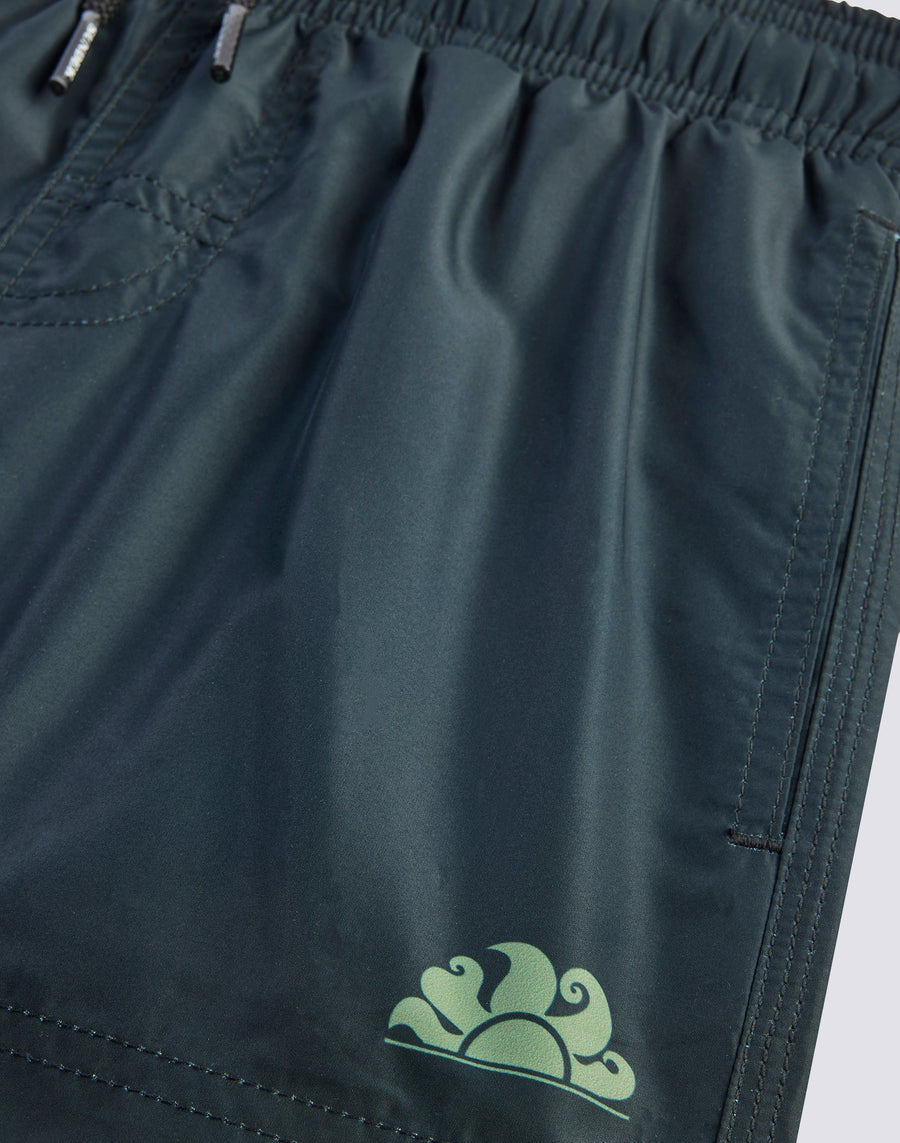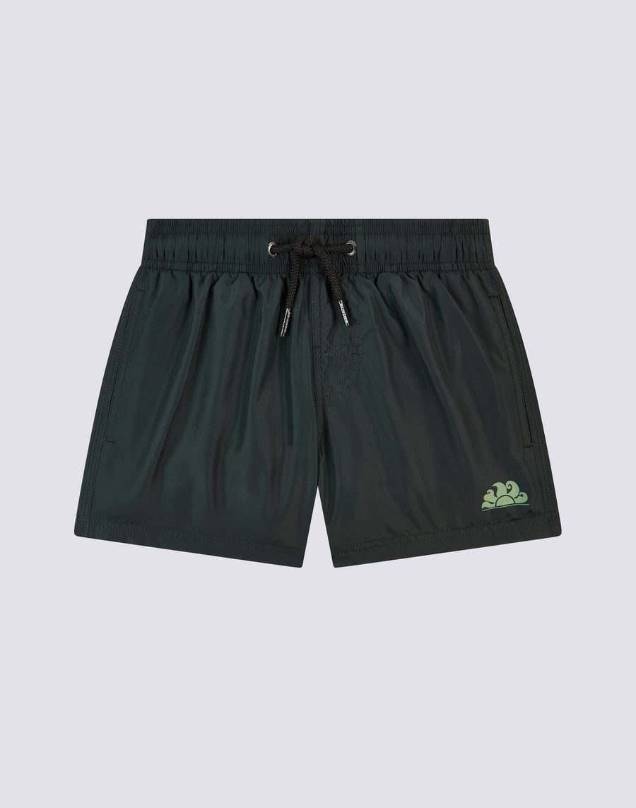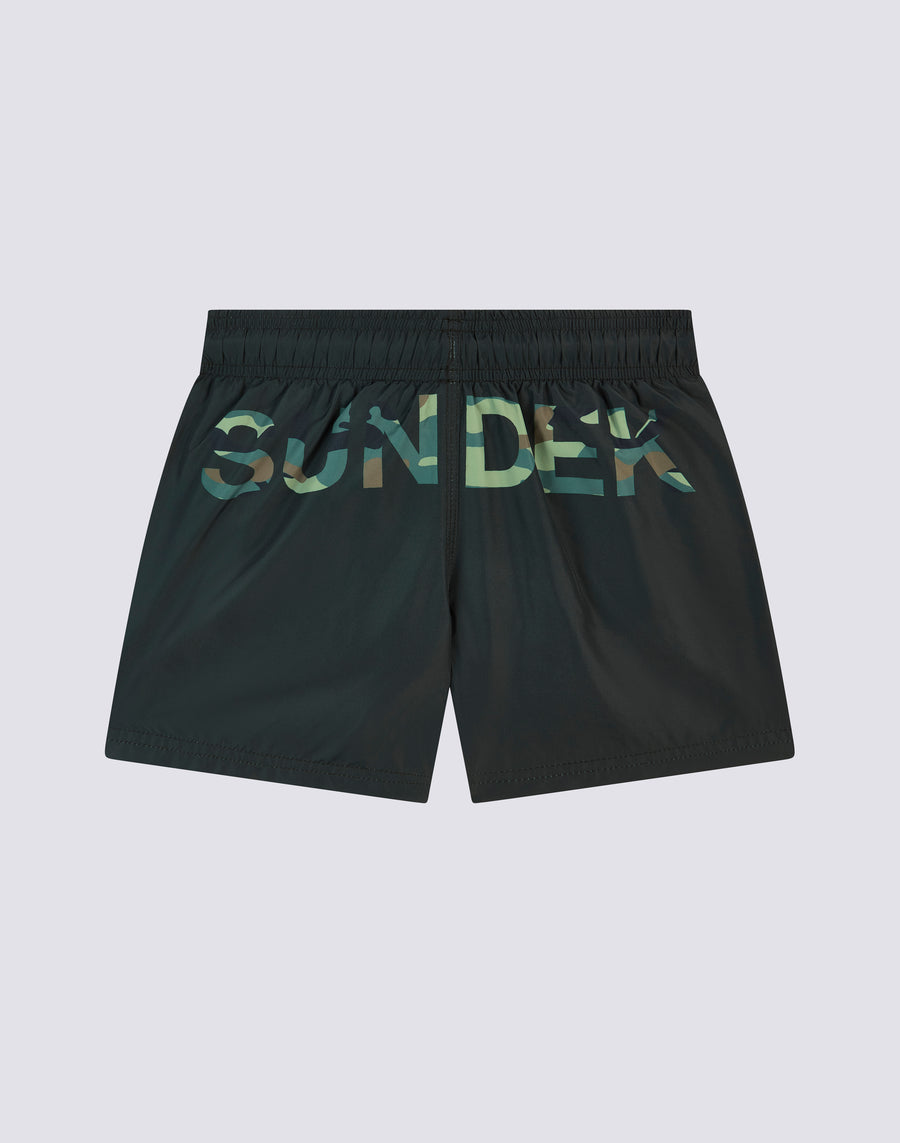 Hyper-comfortable and lightweight recycled polyester fabric for these swimming shorts for boys. A model that will accompany your child in his many activities on holiday, perfect for moving and playing in complete freedom. Made with a camou print logo, it's one to pack year after year.