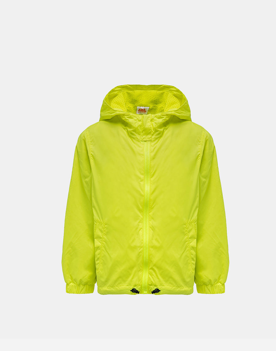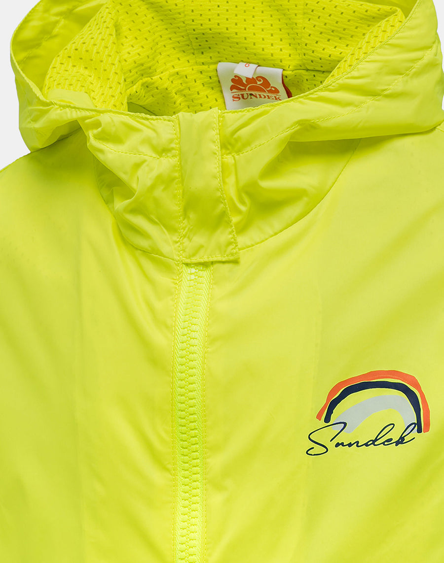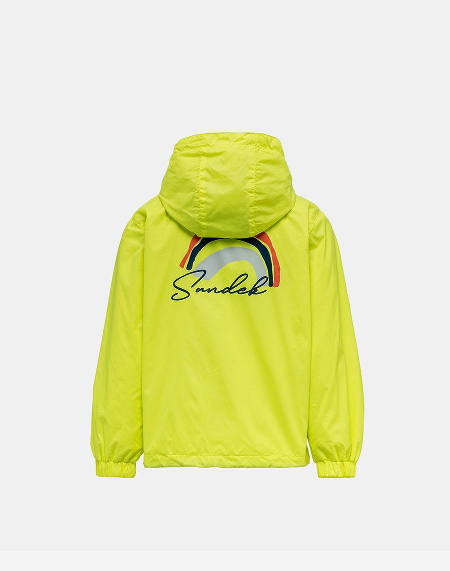 This lightweight and windproof unlined jacket, fastened with a zip and equipped with a hood, is a versatile option, designed to withstand the changing weather. Perfect for little ones who love a sporty look. Embellished with a fun Kidoodle rainbow print,