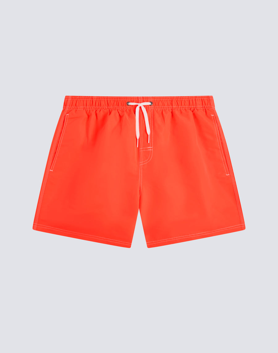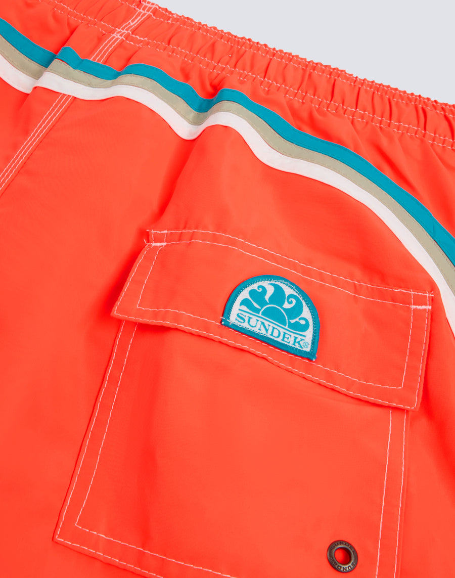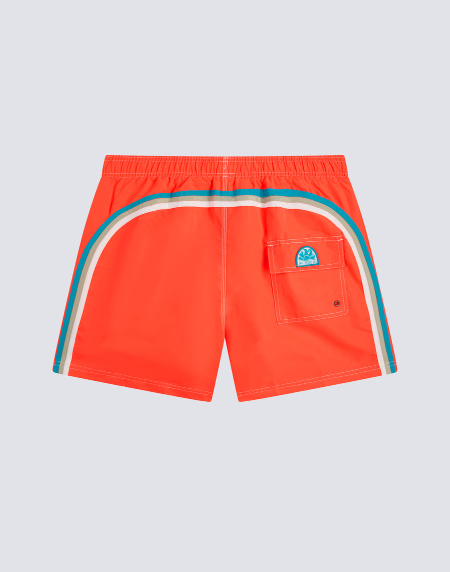 Short men's swim shorts with elasticated waist, drawstring and iconic Sundek rainbow on the back. This swimsuit is made with three-needle stitching and 100% of our historic fabric, nylon-taffeta: smooth as silk, light and resistant to everything, it dries very quickly to give you comfort everywhere, in the waves and outside waterfall. Length 35 cm (size M), measured on the outside of the leg.