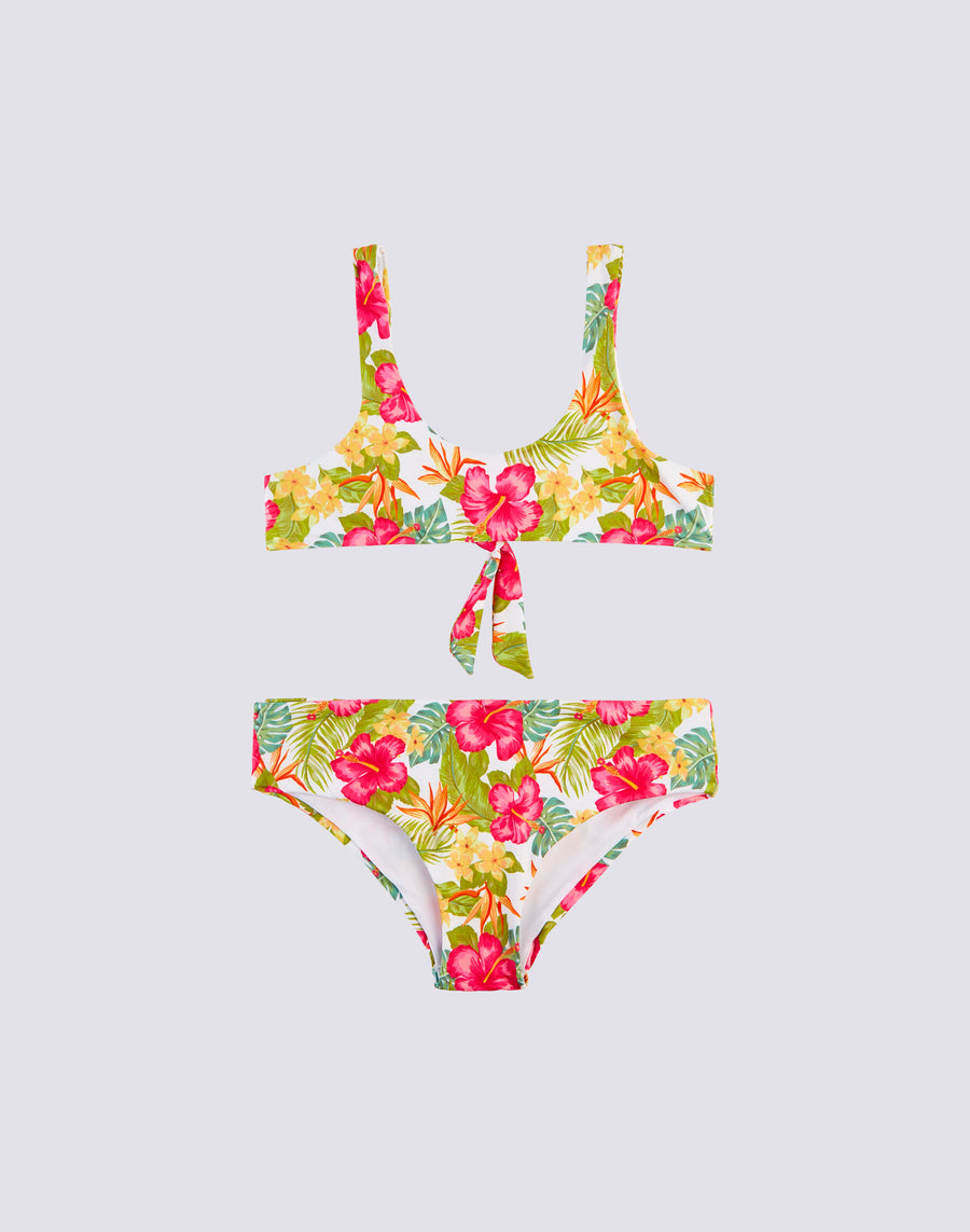 Bring sweetness and joy to your little girls' swimsuit with the Tropicana Sports Mini Bikini Top and Fixed Brief. With an eye-catching tropical print and a fixed bottom, this bandeau swimsuit will keep your little ones entertained while playing in the water.