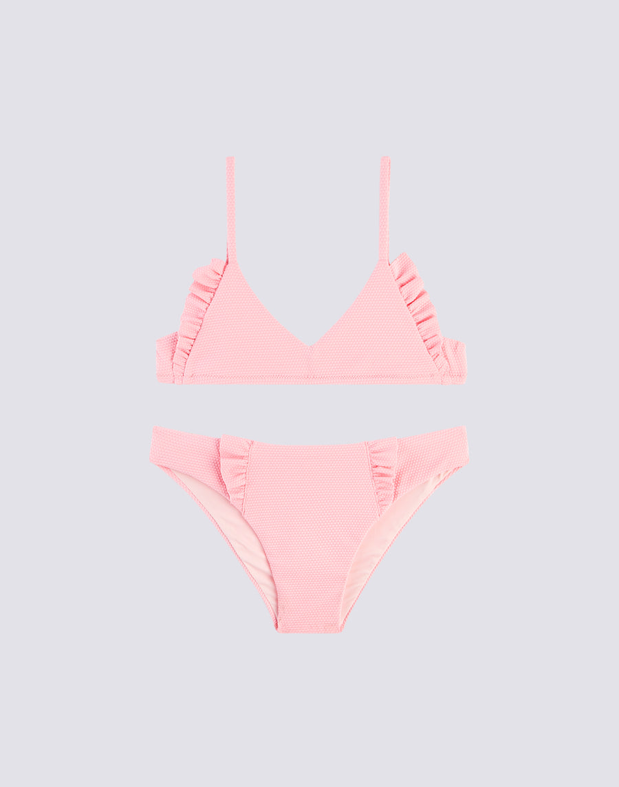 Girls' bikini made up of top and bottoms, both characterized by ruffles. The straps of the top are adjustable, while the bottoms have a fixed waist.