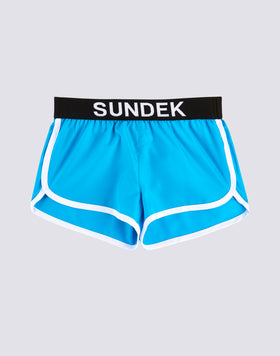 A lightweight shorts with Sundek logo perfect to wear over your swimsuit. Easy to put on, with a light and comfortable fabric, they will accompany your little girl from the beach to summer games. Regular fit. Length 16 cm (size 6) measured on the outside.