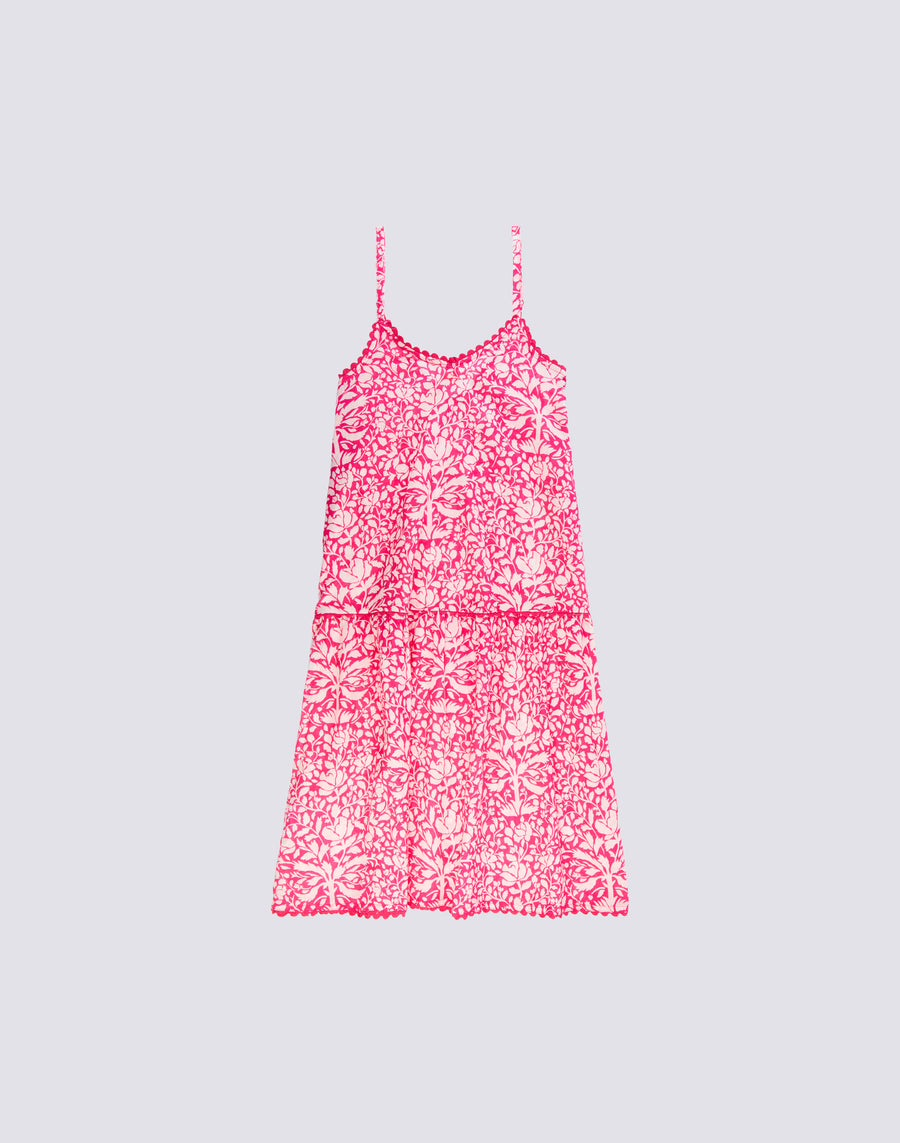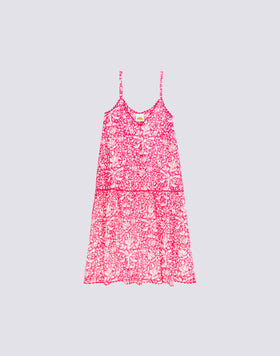 Elegant long dress for girls with adjustable straps and piping detail. The floral print adds a romantic touch. Perfect for a refined and sophisticated look. Combine it with the women's one for a perfect mini me look