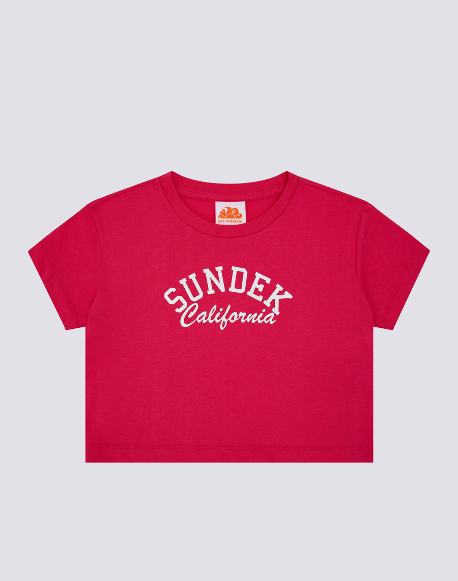 Girls' crop T-shirt with SUNDEK CALIFORNIA print, to wear over jeans or skirts. A must-have for your little girl's wardrobe, made with a vintage wash for a touch of style that makes it even more irresistible.