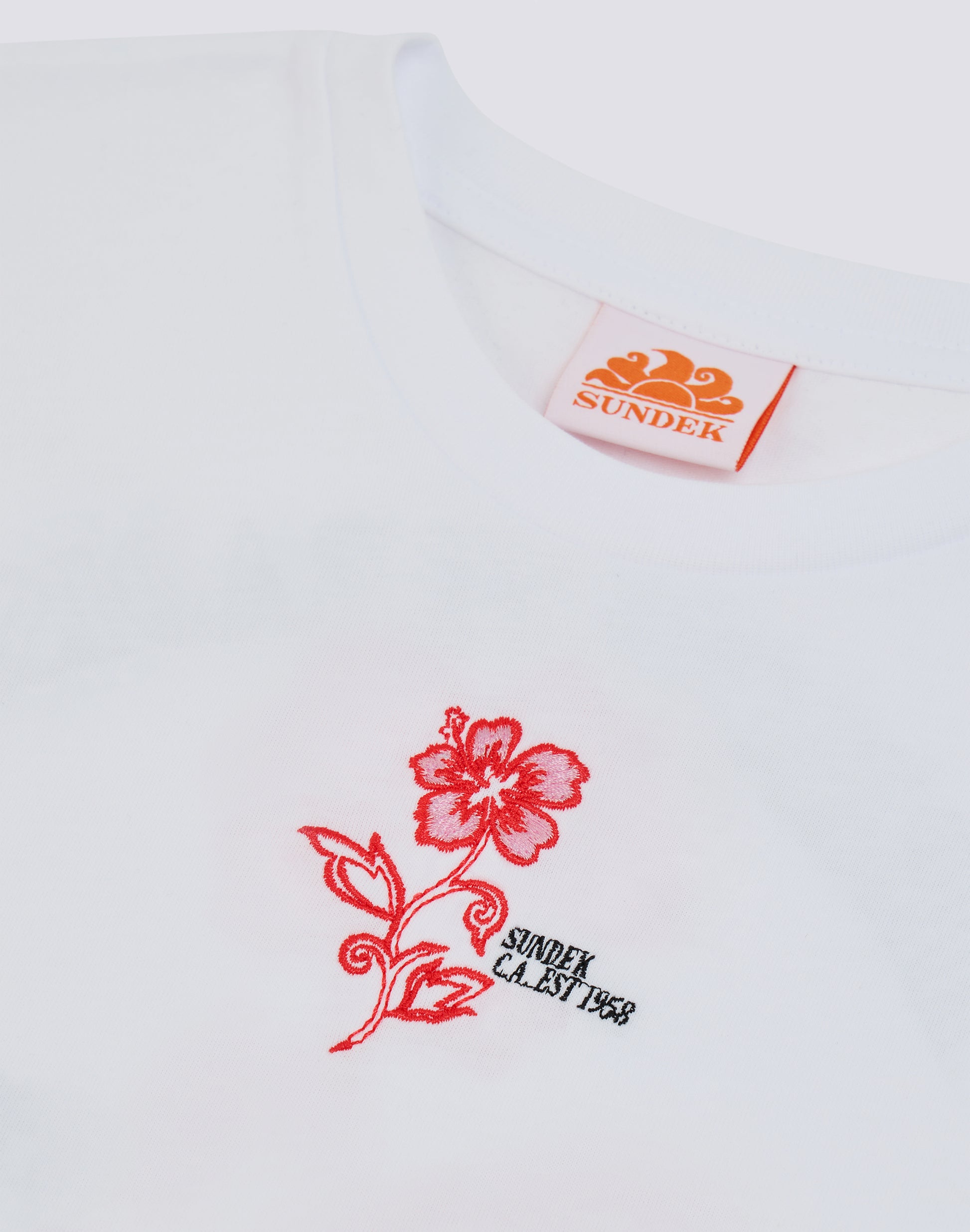 Comfortable girls' short-sleeved T-shirt with embroidered hibiscus on the front and maxi Hibiscus Paradise print on the back.