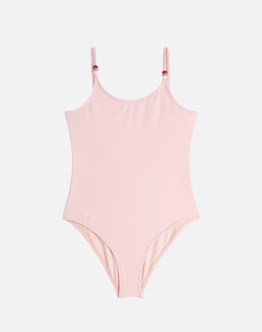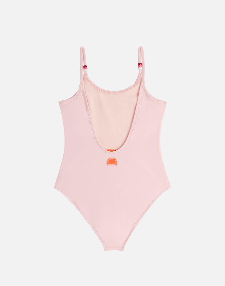 The perfect blend of comfort and style in a one-piece swimsuit: made from VITA by Carvico fabric, it is soft and comfortable, with a plunging neckline at the back and spaghetti straps decorated with tricolour beads.