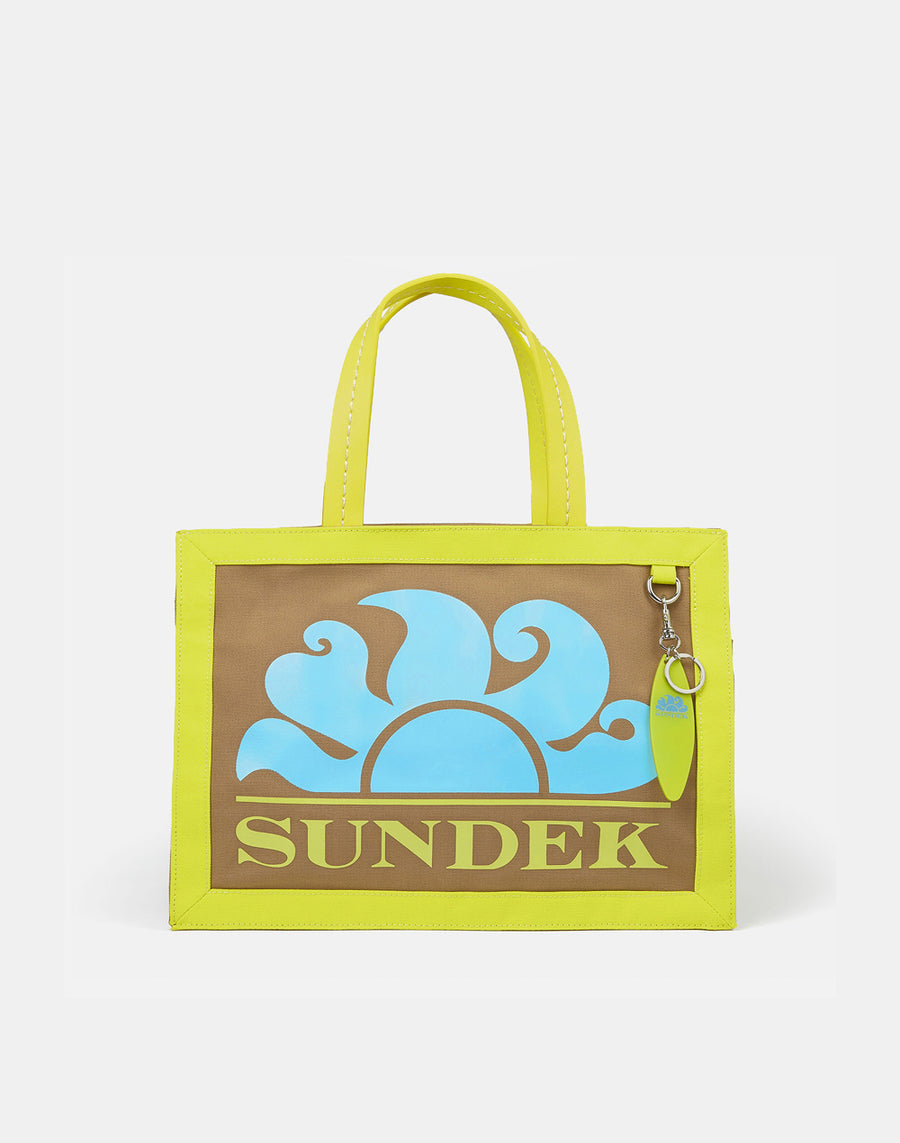 Medium canvas handbag with a printed Sundek logo. Iconic surfboard charm