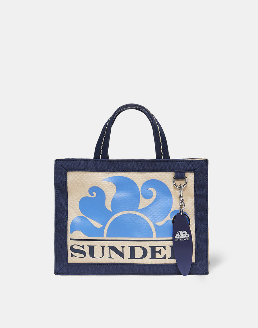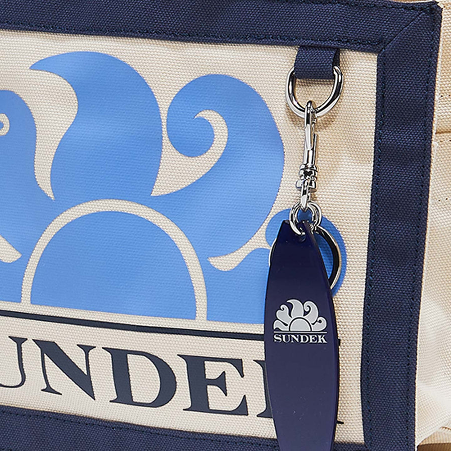 Small bag designed to carry by hand or across the body. Made from canvas with a printed logo and detachable crossbody strap. Iconic surfboard charm inspired by the history of Sundek