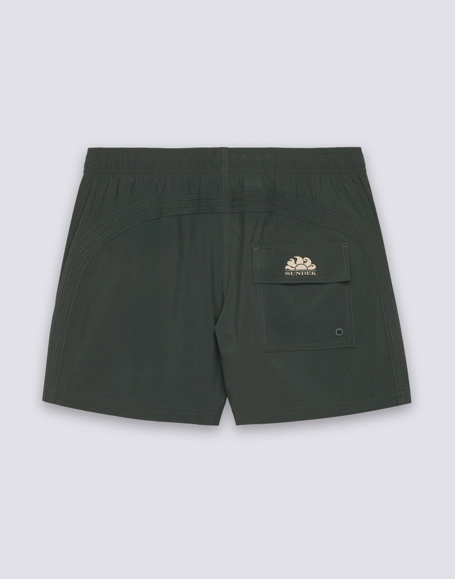 Get ready to catch the next wave in the Goldenwave solid elastic-waist short swimsuit in 4Way Stretch fabric . This solid color features a tonal rainbow print on the back and a contrasting logo pocket with Velcro closure. The elastic waistband offers optimal comfort and a drawstring closure for a custom fit.