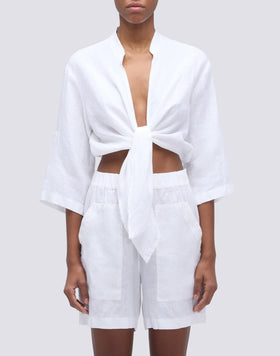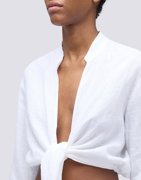 Garment-dyed linen shirt with cropped cut and knot fastening, gathered sleeves and mandarin collar. Fresh and jaunty, for informal and casual looks.