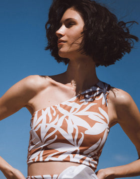 The BIMALA one-shoulder top, with its optic flower print, will make you feel elegant and fashionable, to always be glamorous even on days at the beach. To be combined with the coordinated briefs.