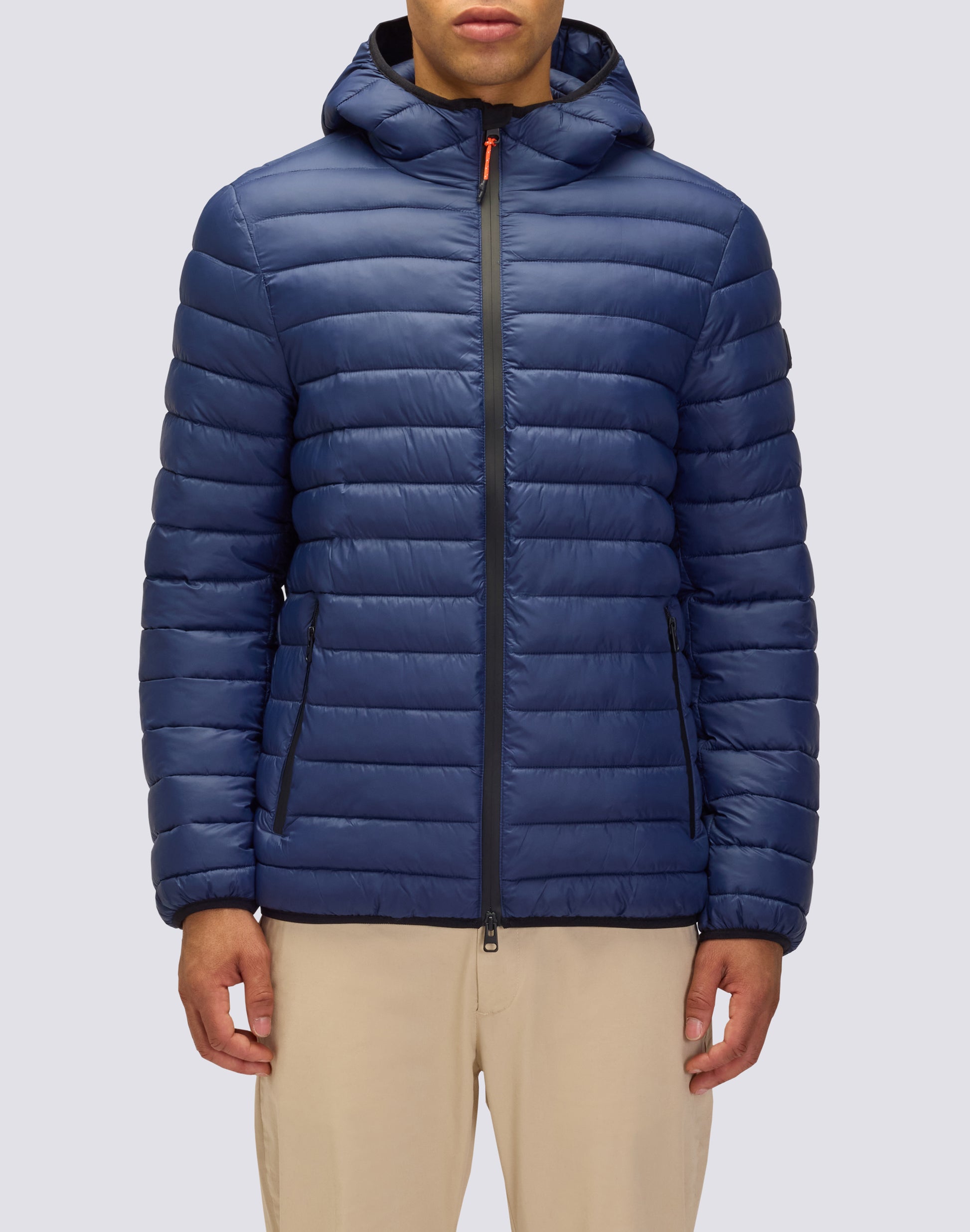 Men's short down jacket with a hood in superlight matte nylon fabric quilted with horizontal channels and internal padding in Repreve recycled polyester synthetic fiber. This garment features numerous technical details, making it a functional and practical jacket. Regular fit, medium warmth.