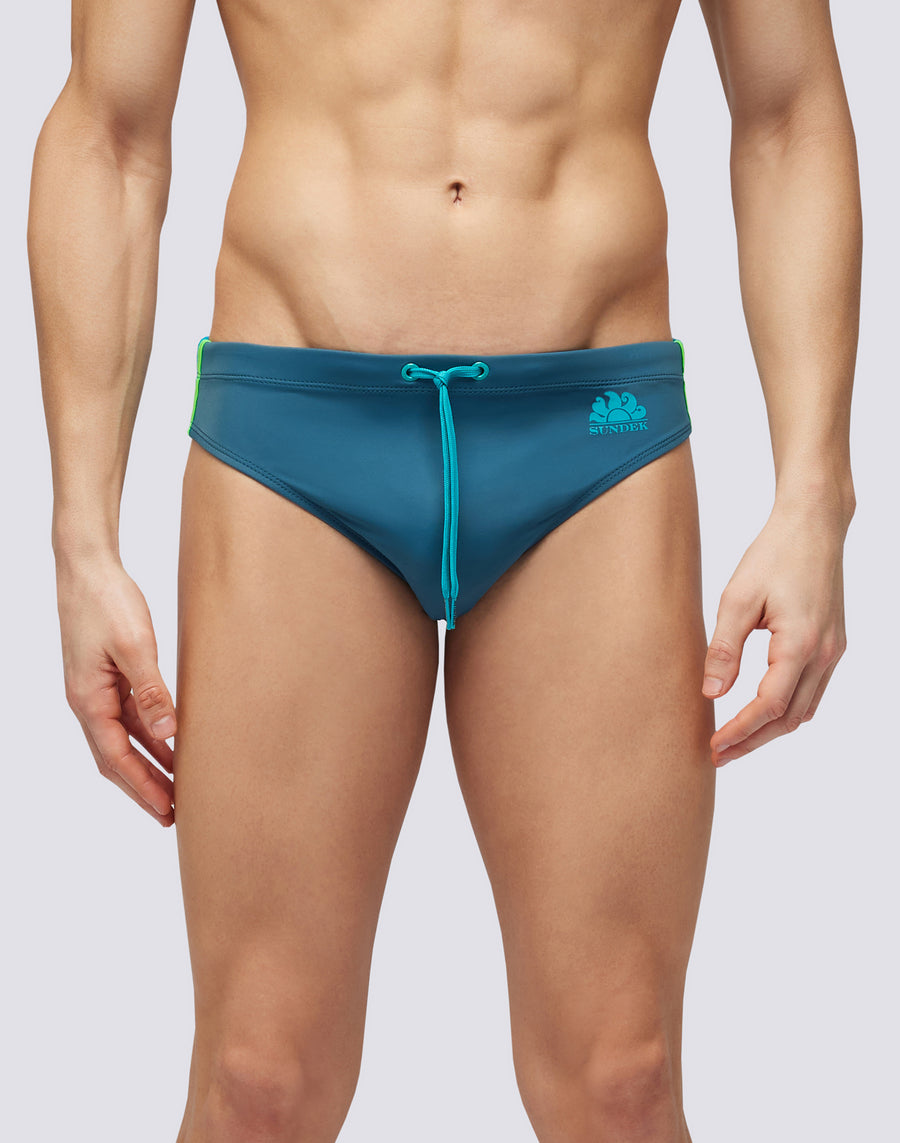 Solid color men's swimsuit briefs with adjustable waist. The monochrome swim briefs with drawstring and three contrasting colored side bands for a strong and functional look. It dries quickly and gives you comfort and durability in and out of the water: wear it for swimming and training and when you rest and sunbathe.